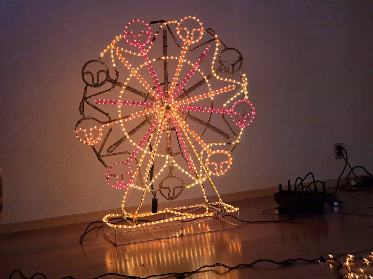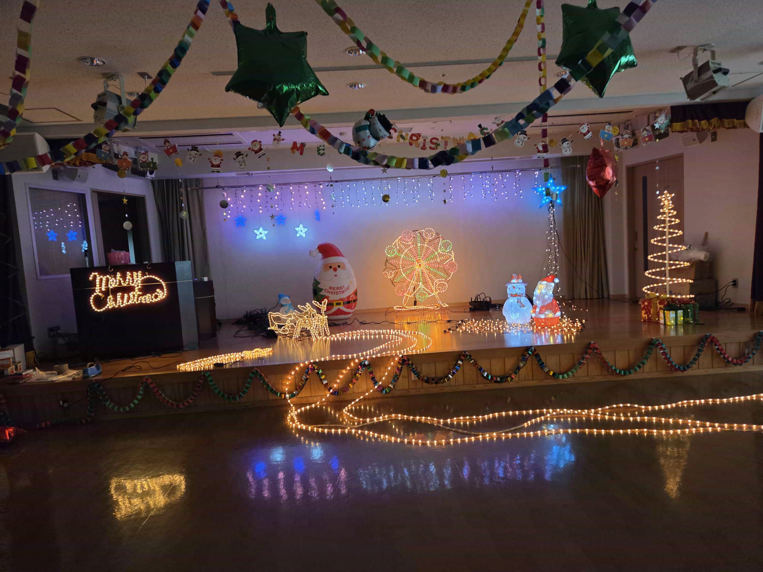 電光飾りつけに囲まれて日中活動をしています。