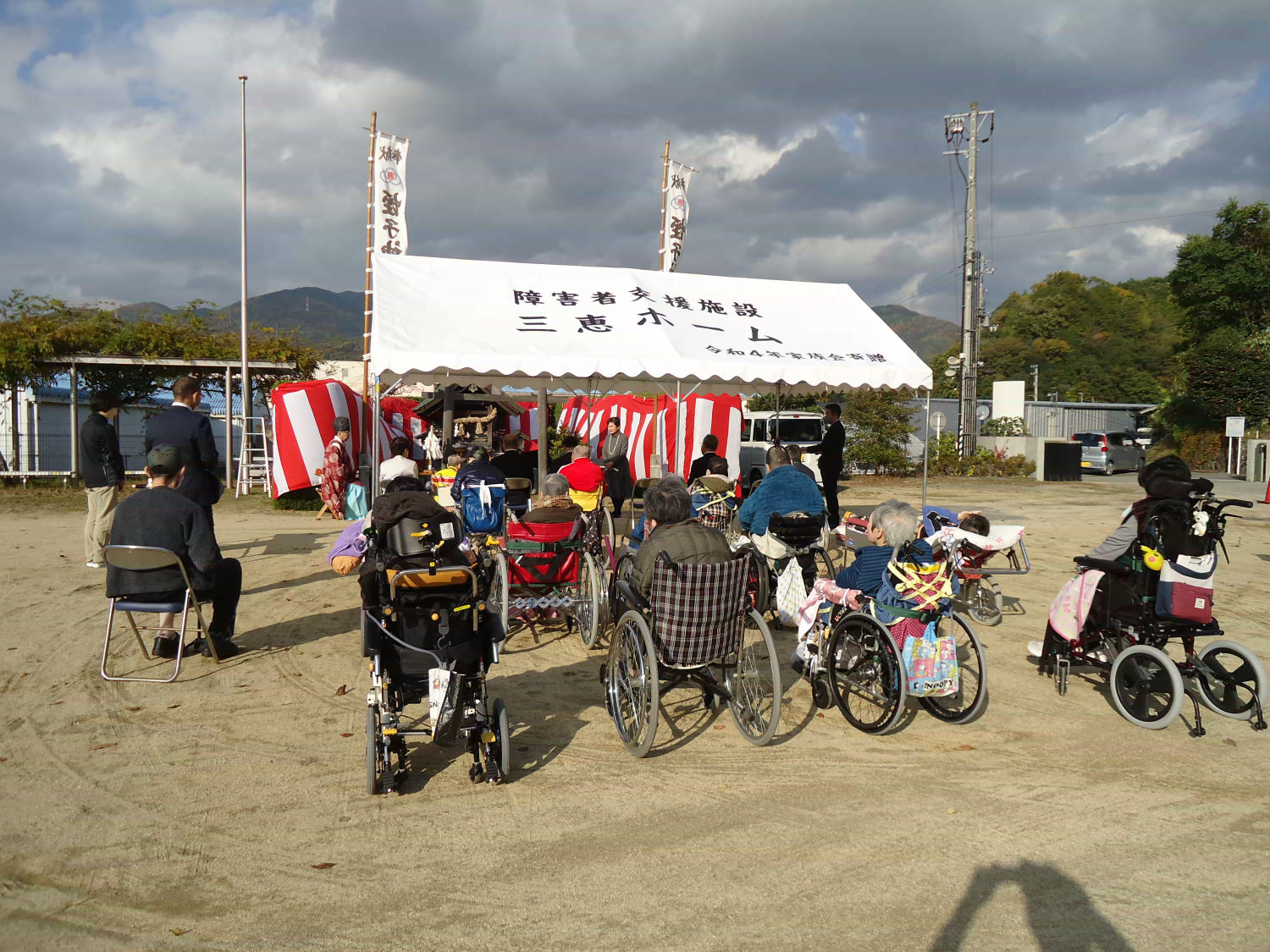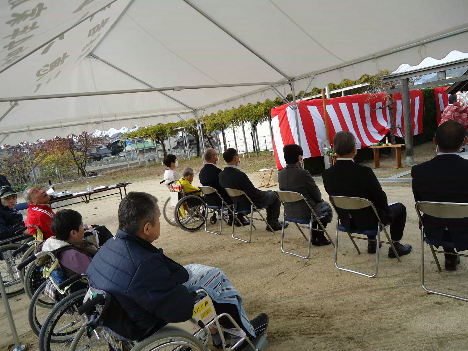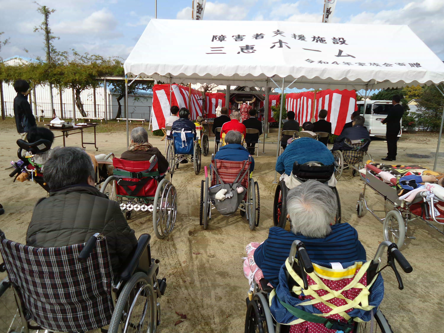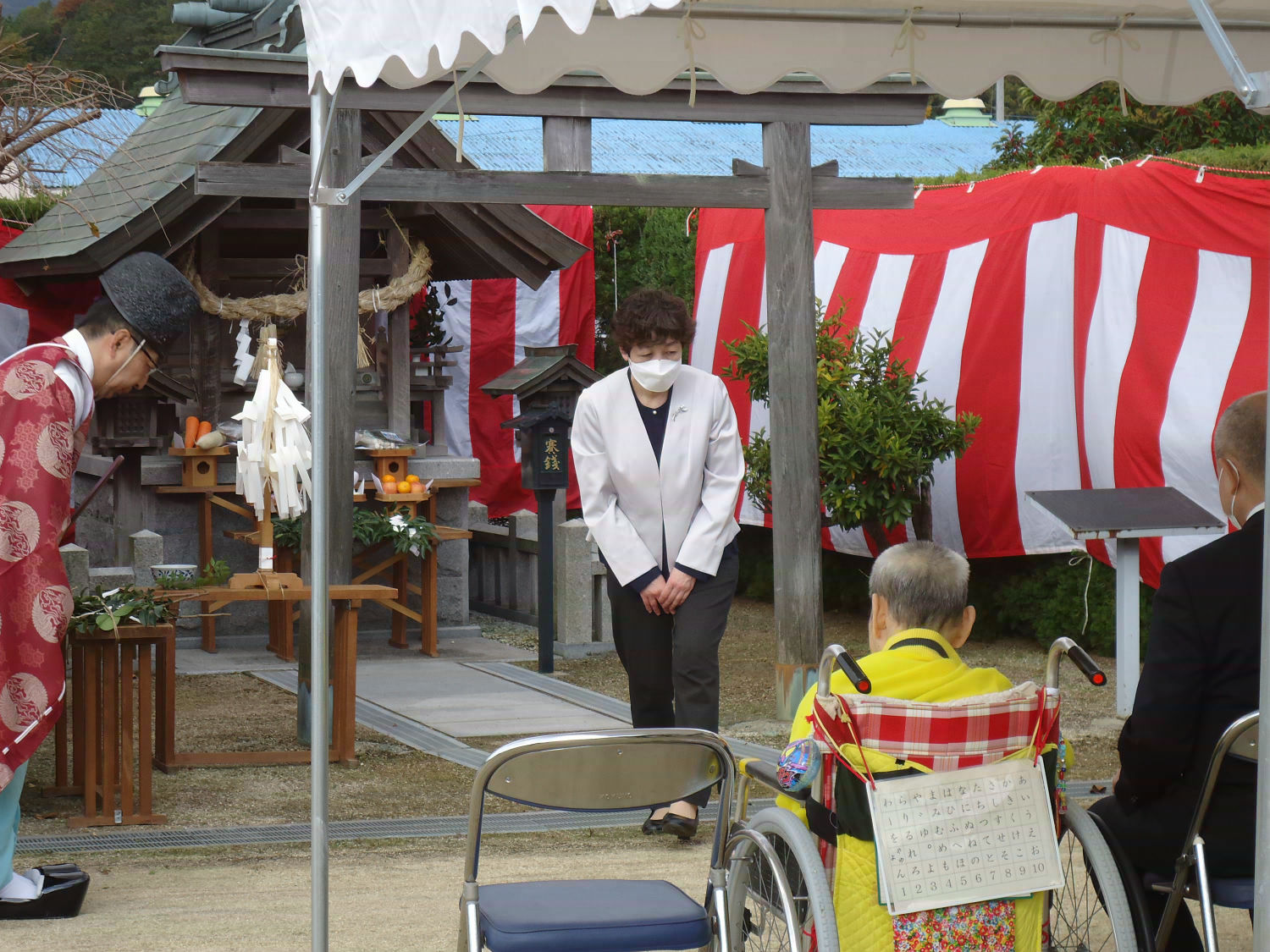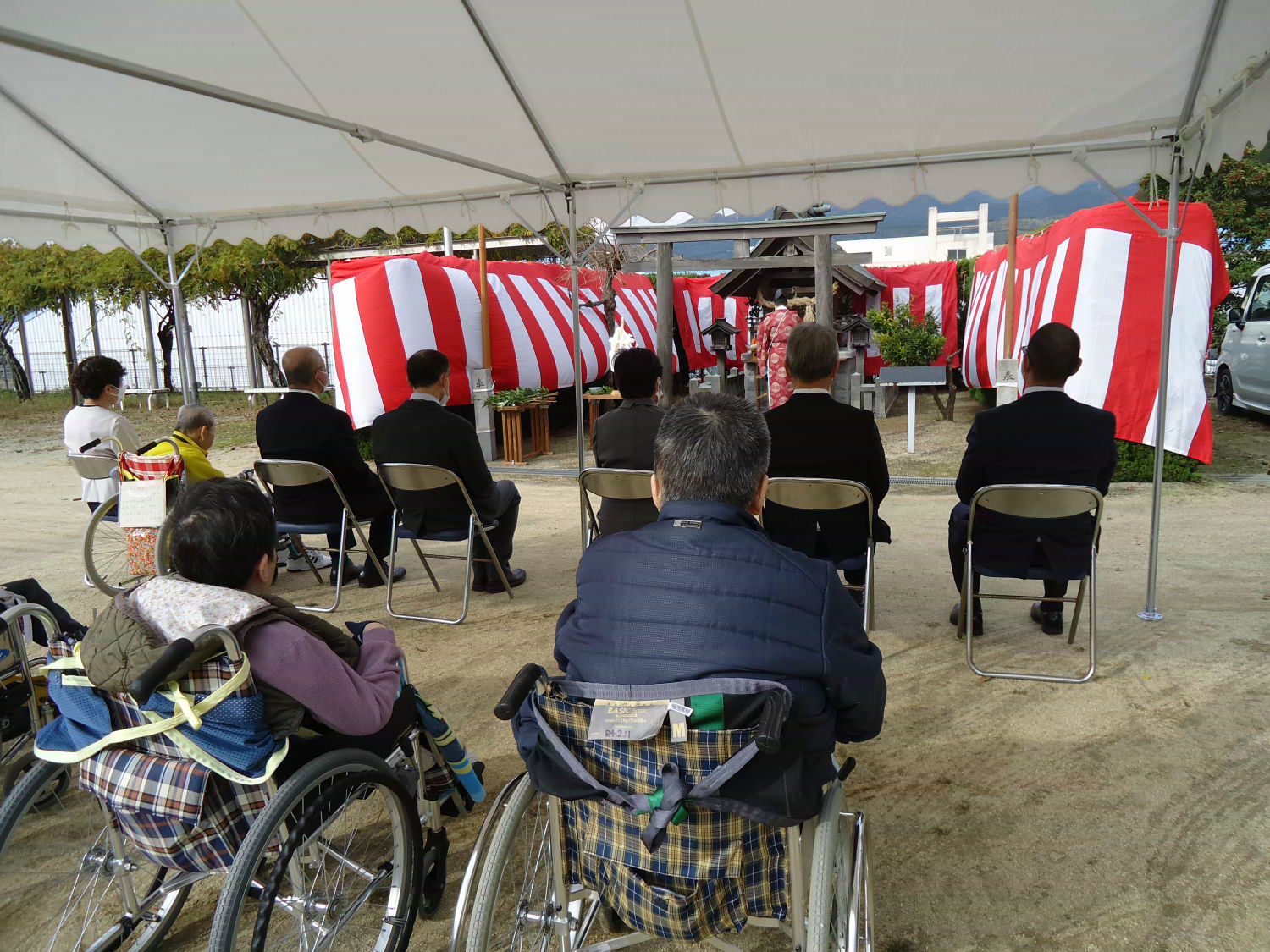三島神社の方をお招きし、年に一度の神事を執り行いました。肌寒い中でしたが、多くの利用者様が見守る中、利用者代表の自治会会長様も玉串を奉奠して、今後の無病息災をお祈りしました。