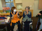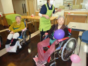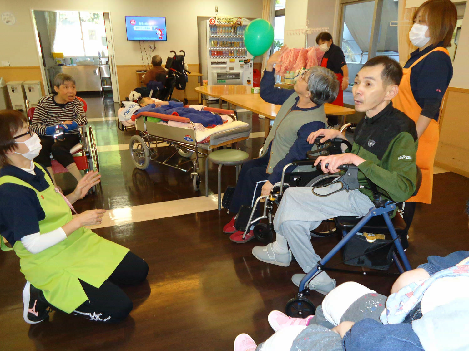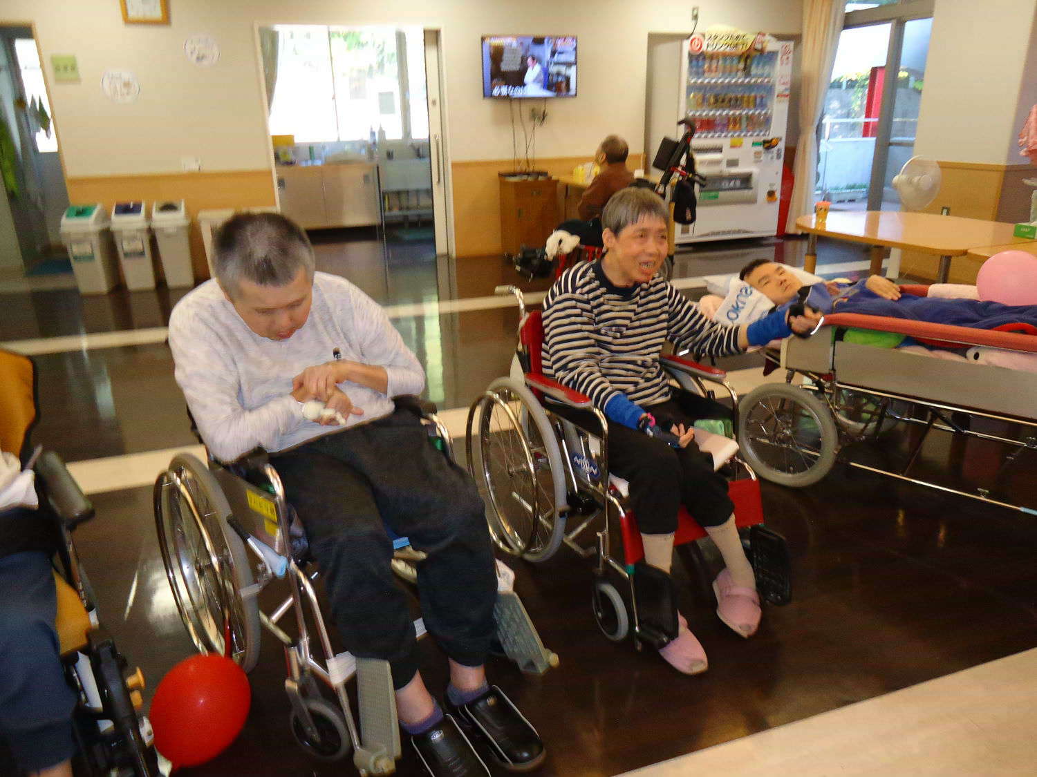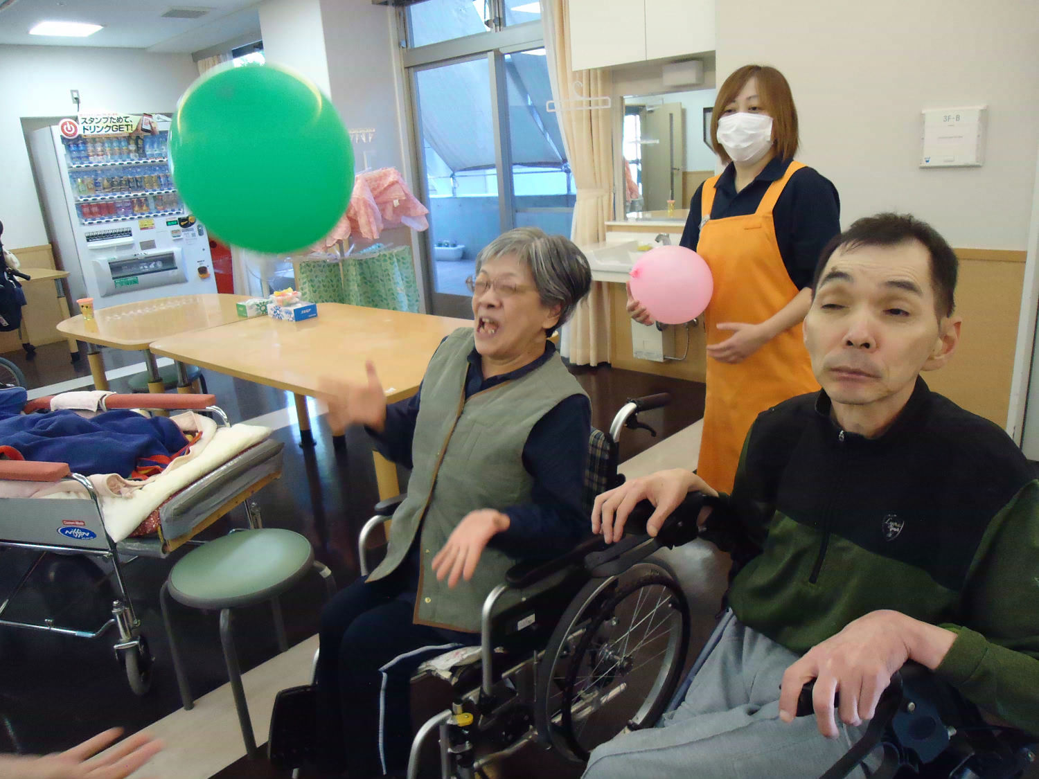 風船バレーの前に、以前研修で教わった≪笑いヨガ≫を利用者さんにしていただき、皆さん大きな口を開けて笑われました。その後の風船バレーも楽しむことが出来ました。