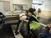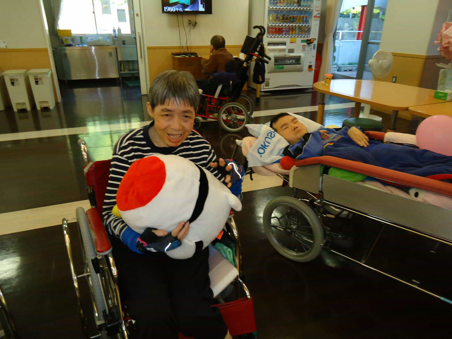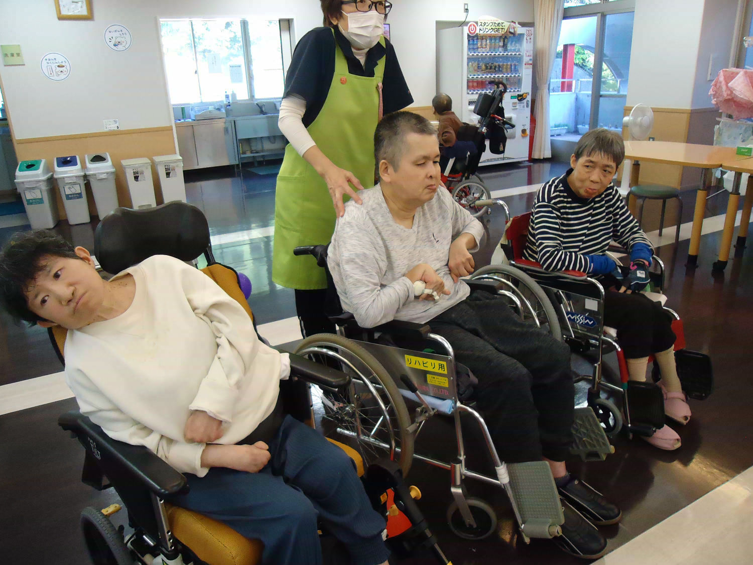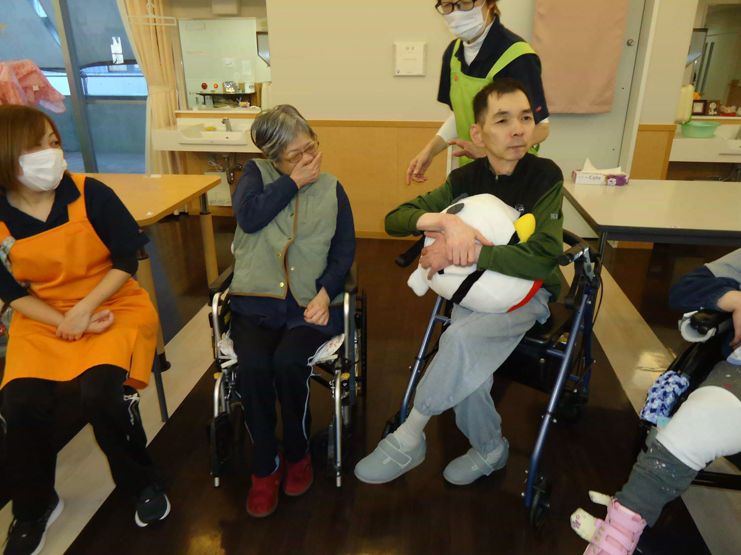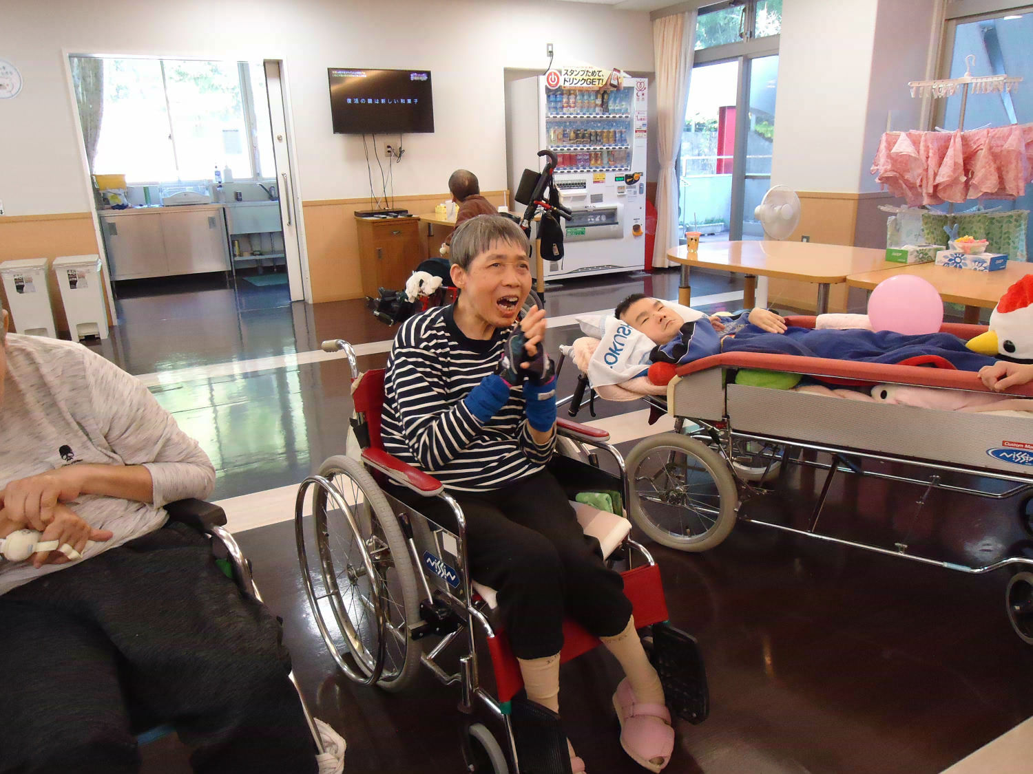 風船バレーの前に、以前研修で教わった≪笑いヨガ≫を利用者さんにしていただき、皆さん大きな口を開けて笑われました。その後の風船バレーも楽しむことが出来ました。