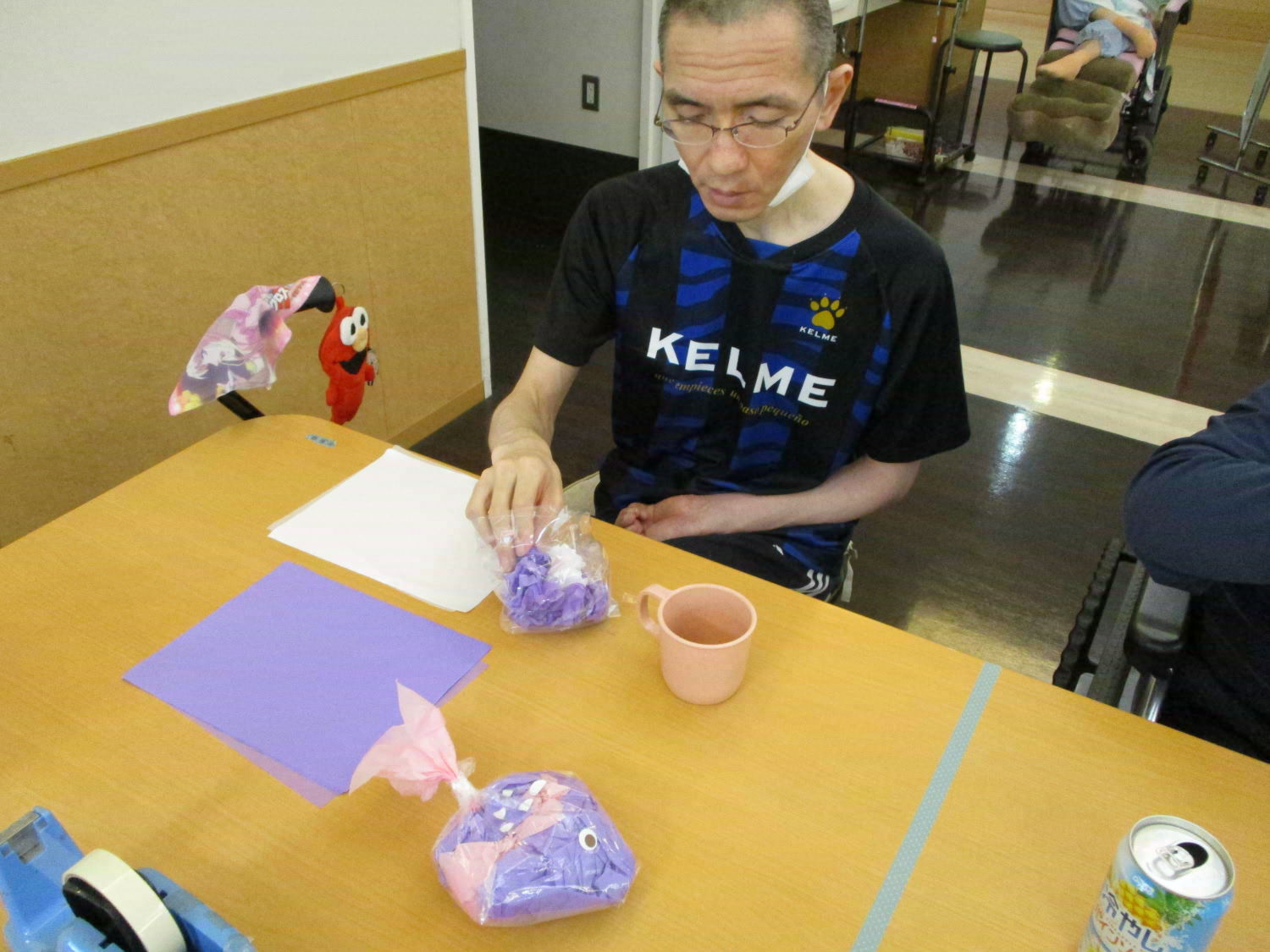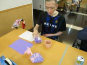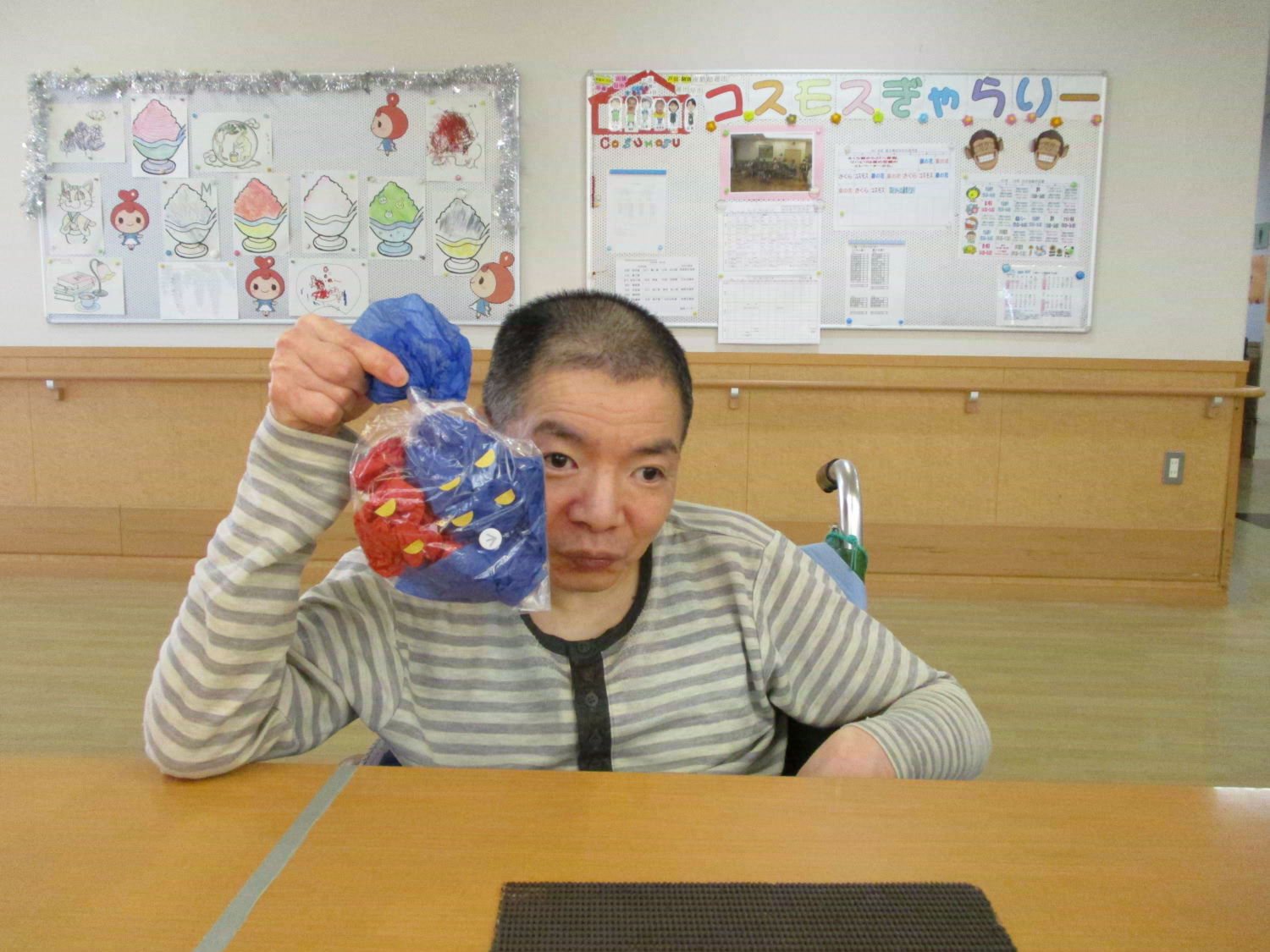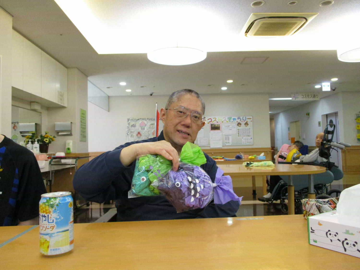 好きな色を選んで、袋に詰めると完成!カラフルな魚が沢山できました。どこに飾ってもらおうかな〜。