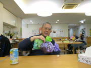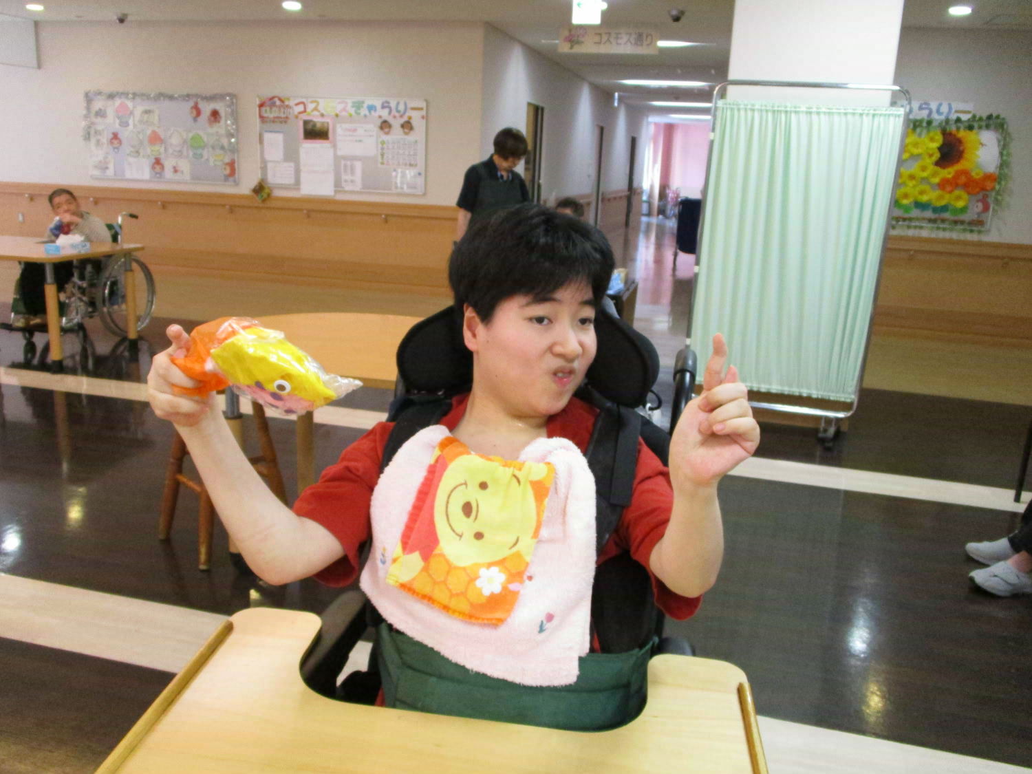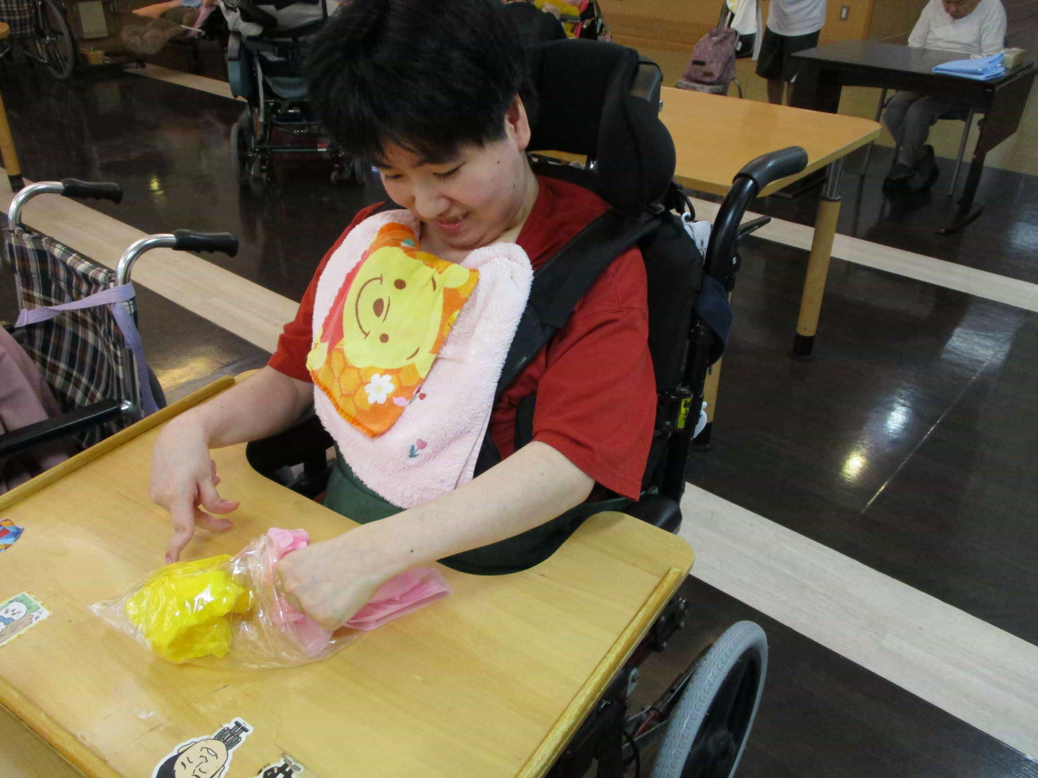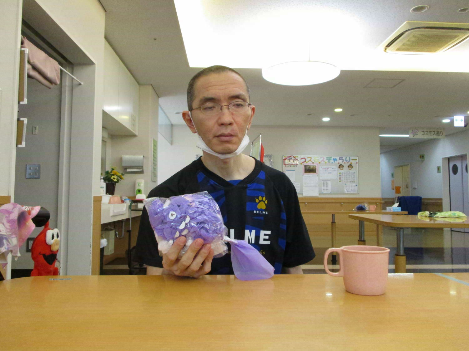 好きな色を選んで、袋に詰めると完成!カラフルな魚が沢山できました。どこに飾ってもらおうかな〜。