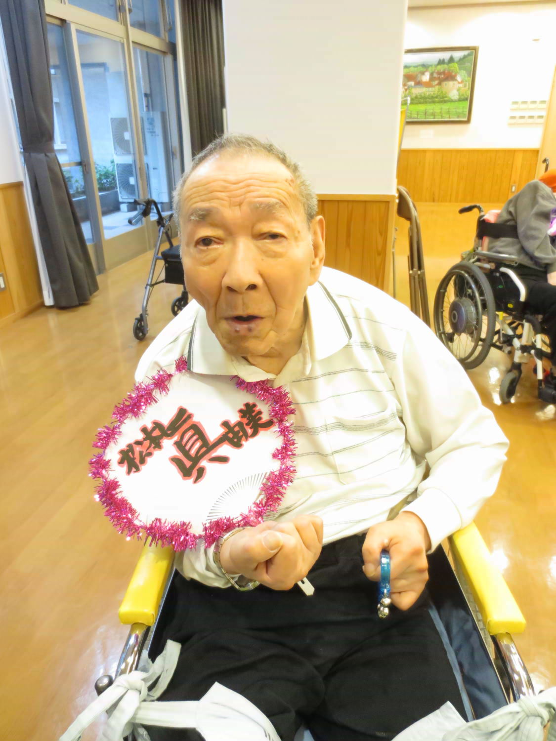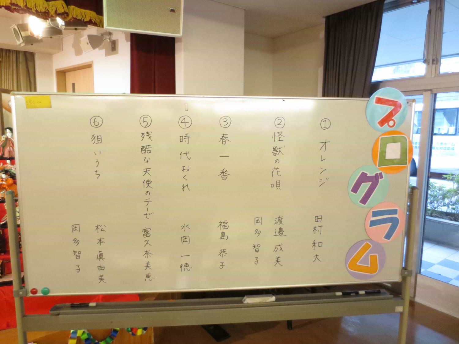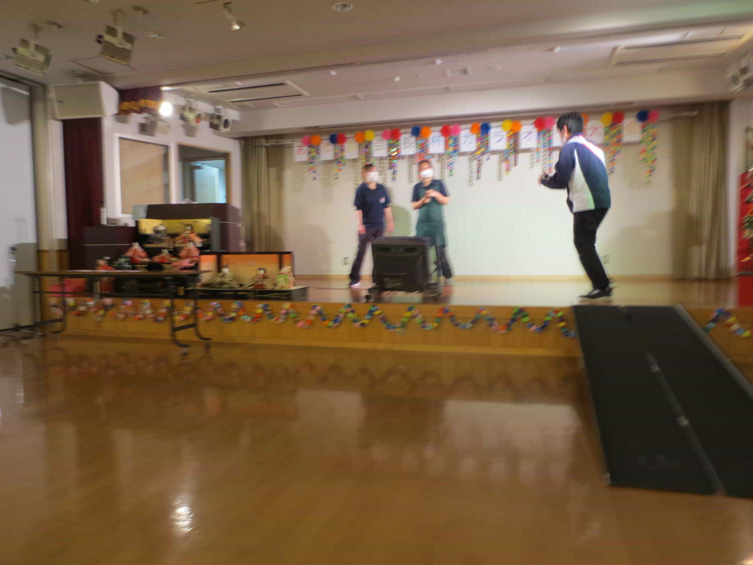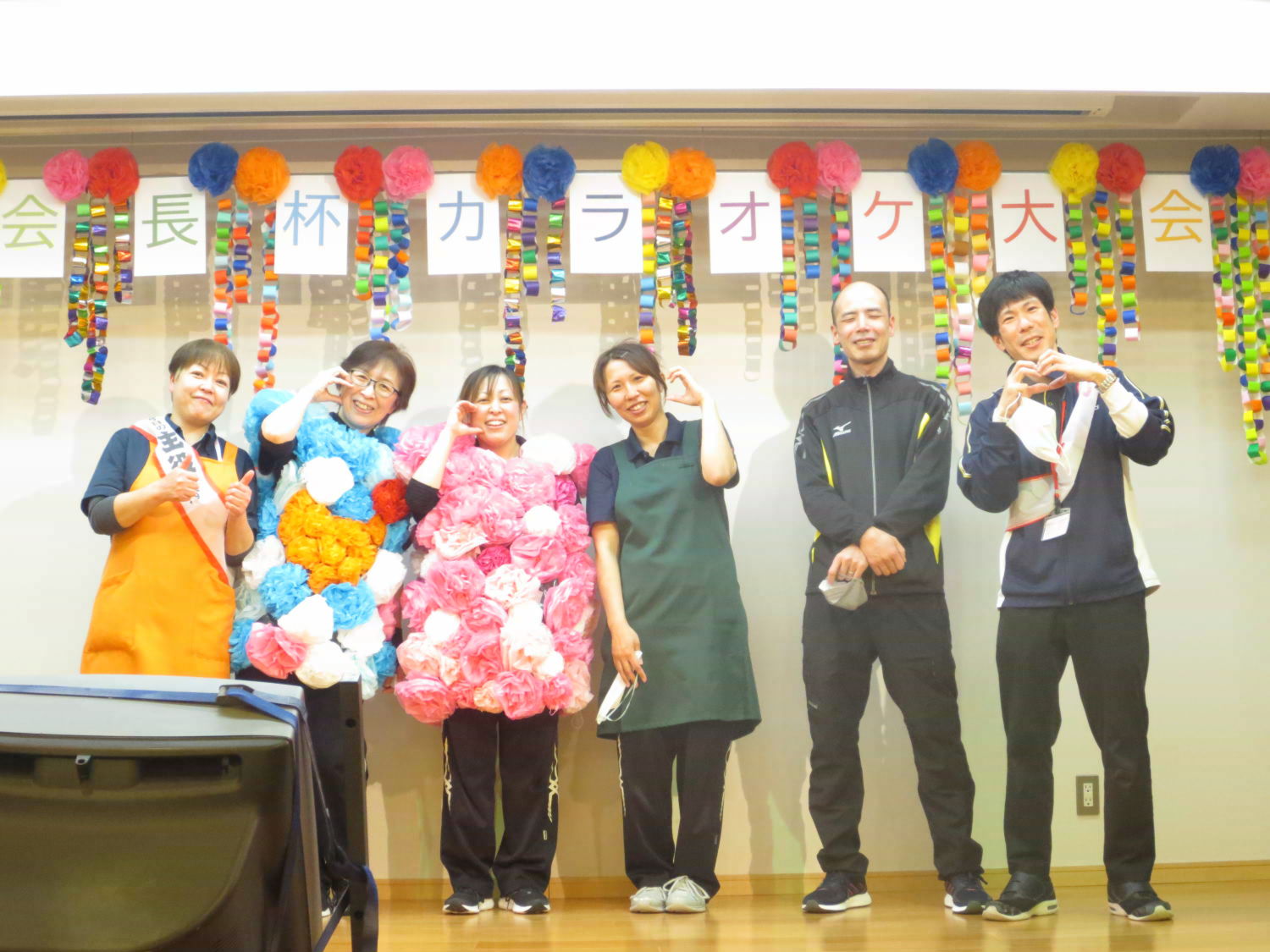 本日は利用者様の自治会である「あゆみ会」が主催するカラオケ大会がありました!いつもは利用者様の歌声を聴いている職員ですが、本日は立場が逆転!舞台に立って、歌声を披露しました♪