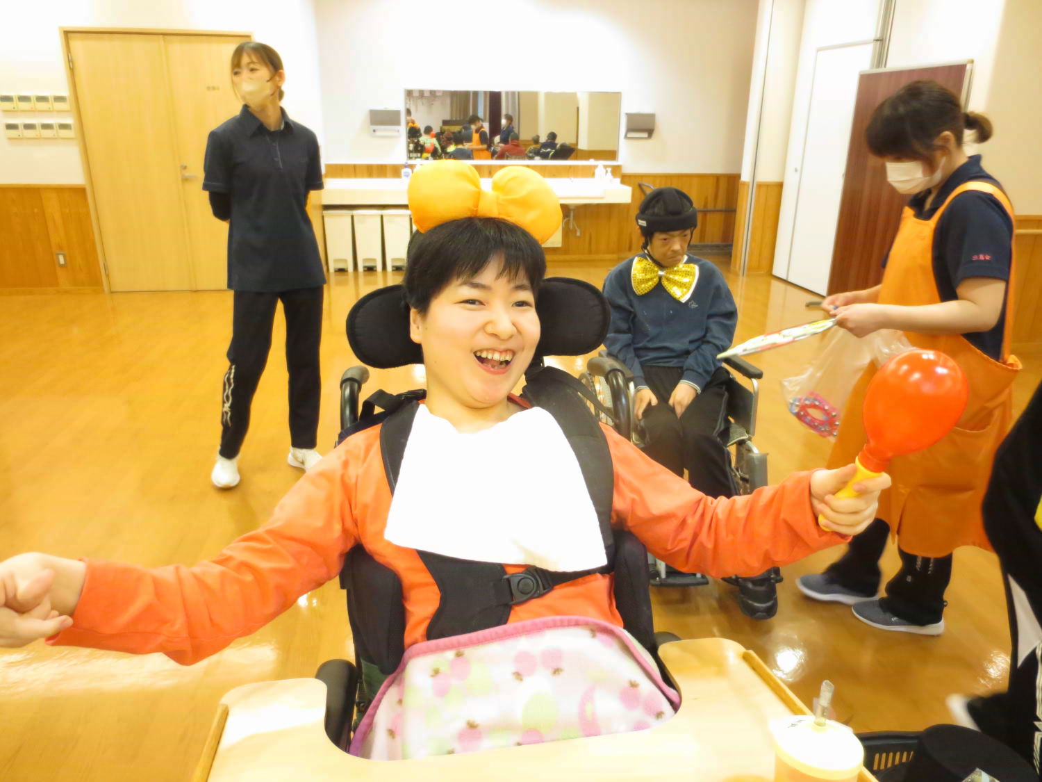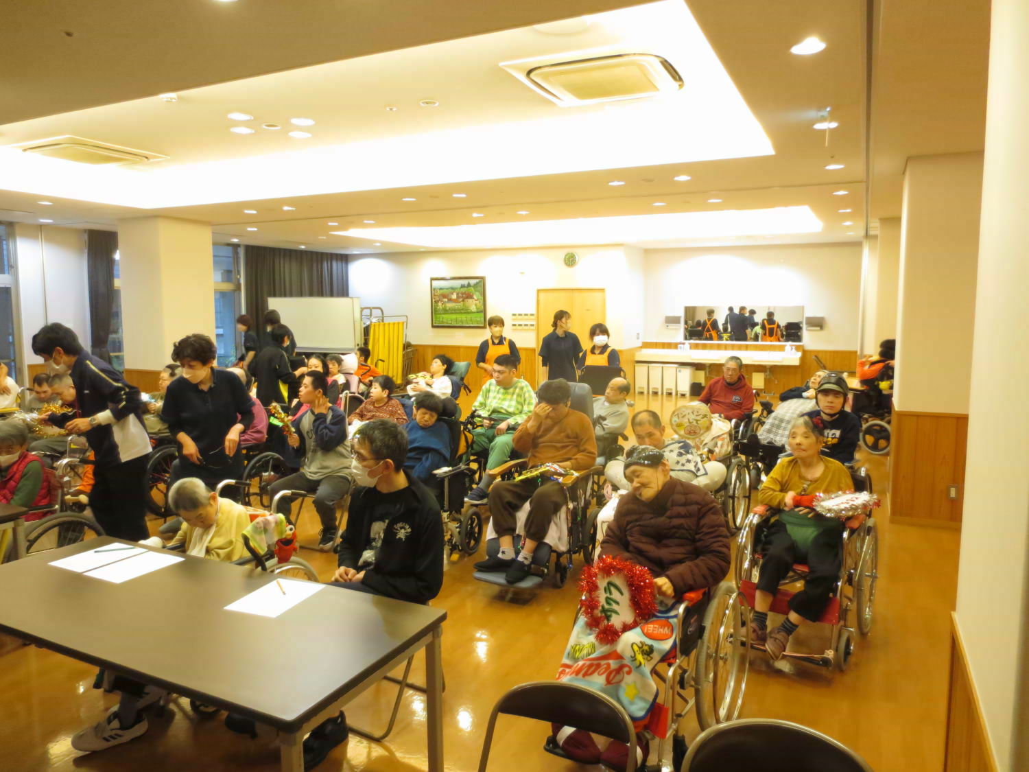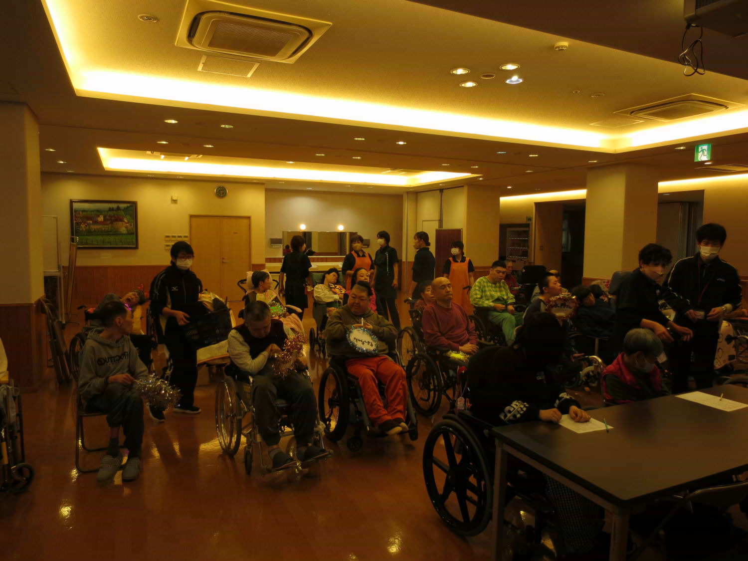 本日は利用者様の自治会である「あゆみ会」が主催するカラオケ大会がありました!いつもは利用者様の歌声を聴いている職員ですが、本日は立場が逆転!舞台に立って、歌声を披露しました♪