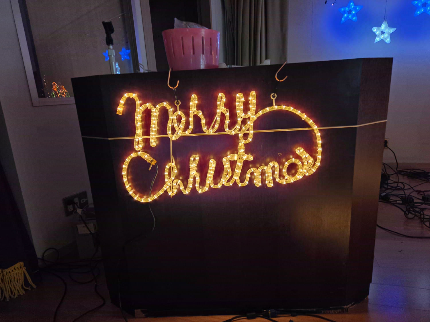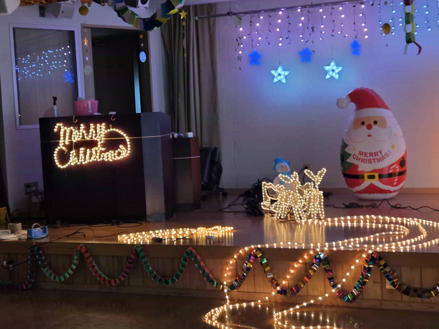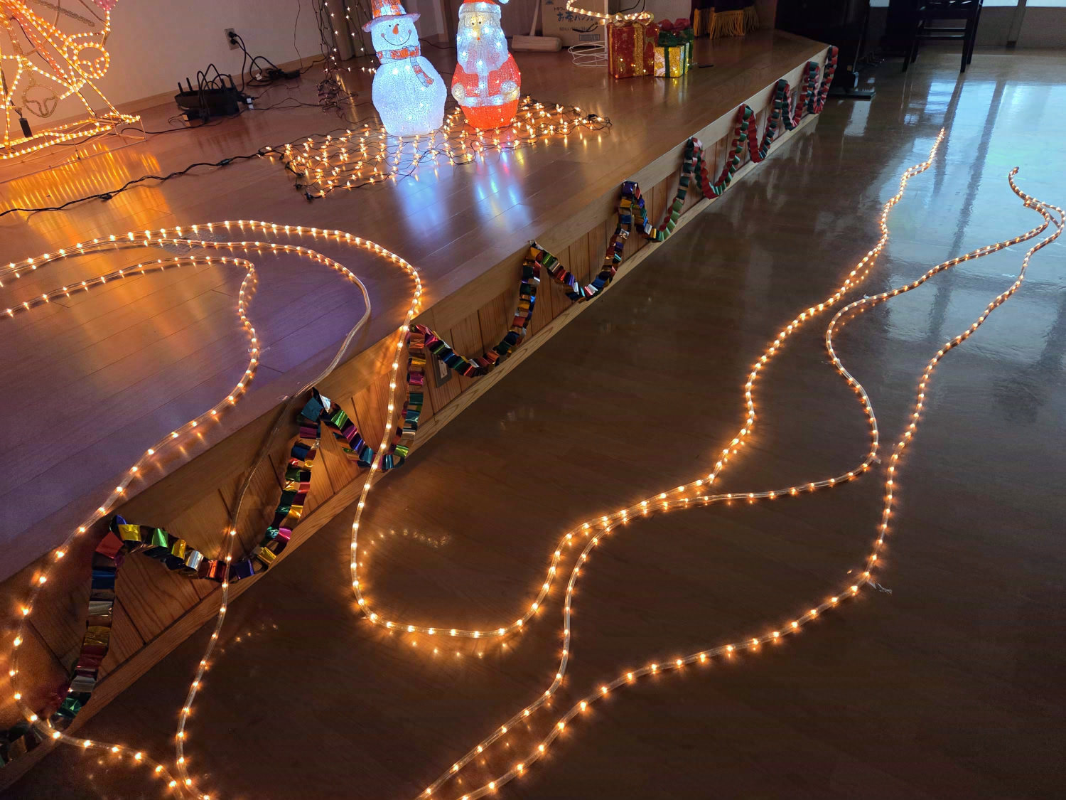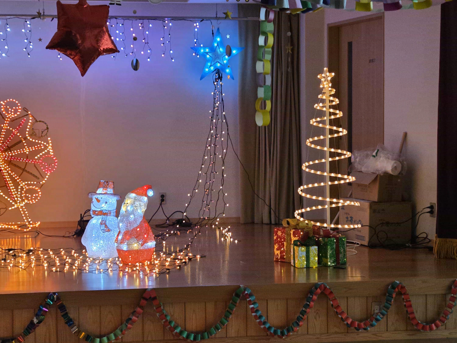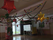 電光飾りつけに囲まれて日中活動をしています。