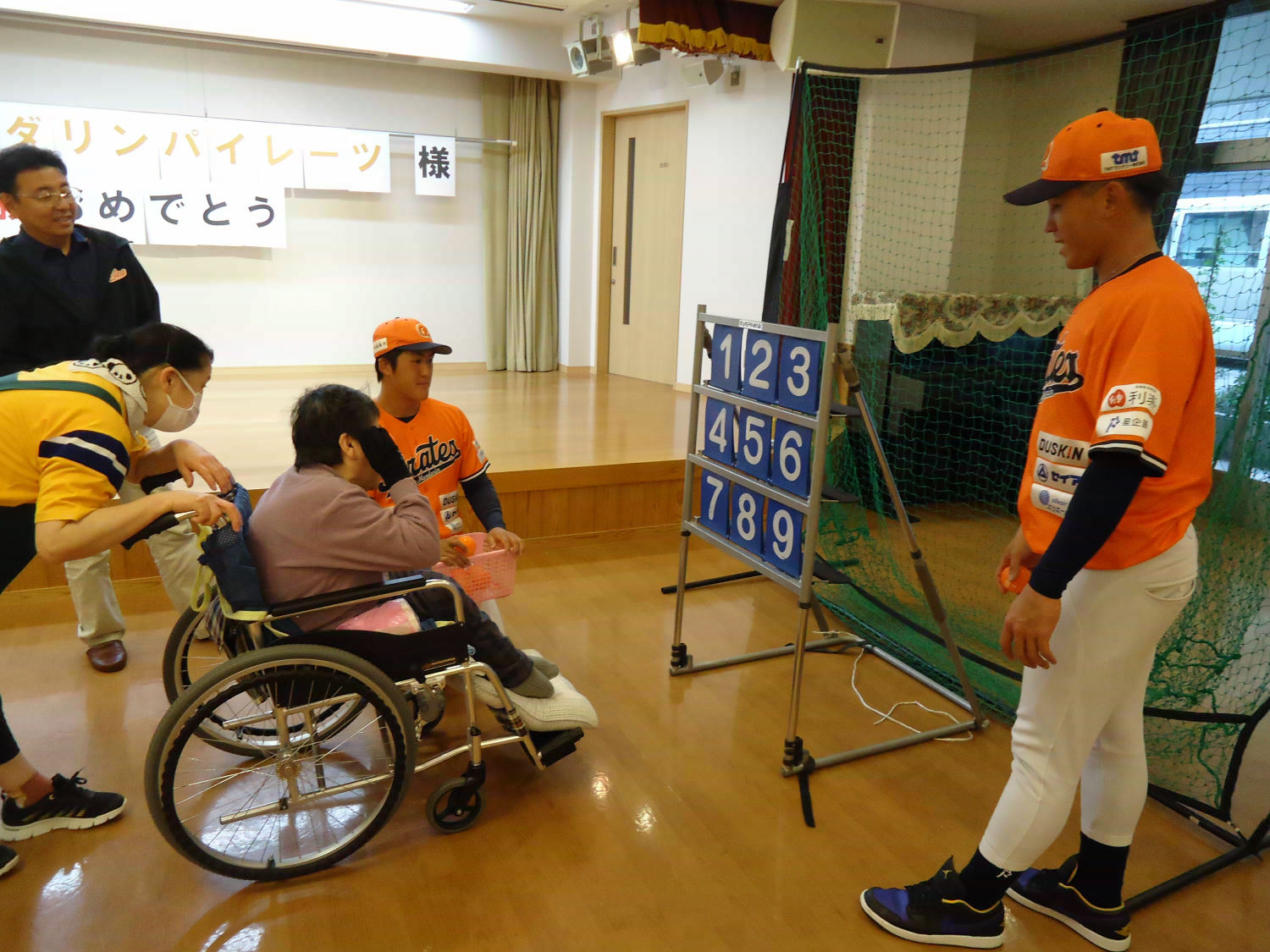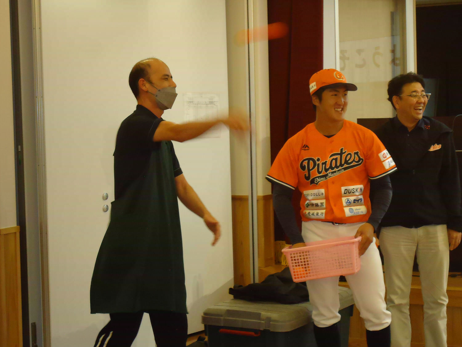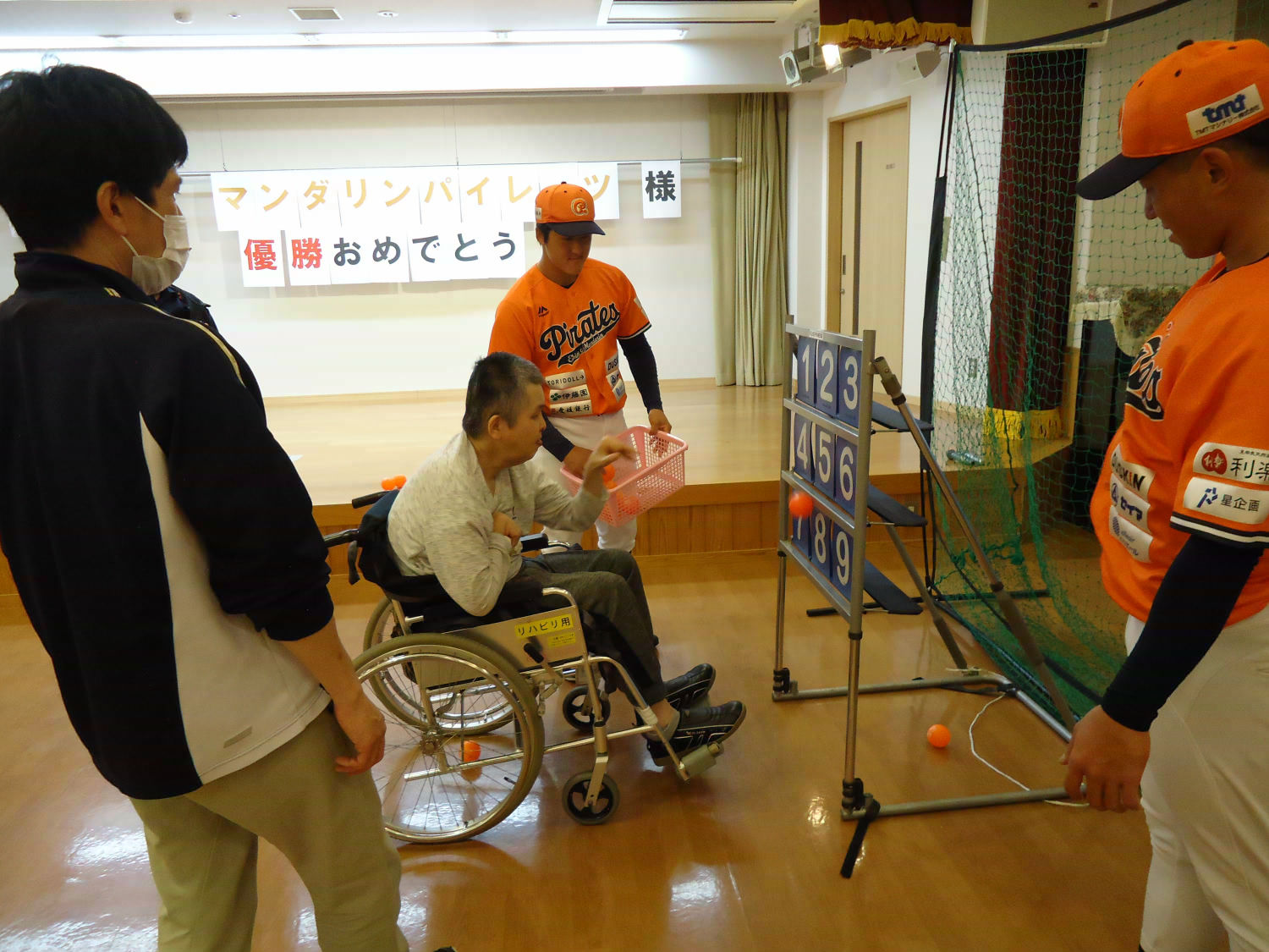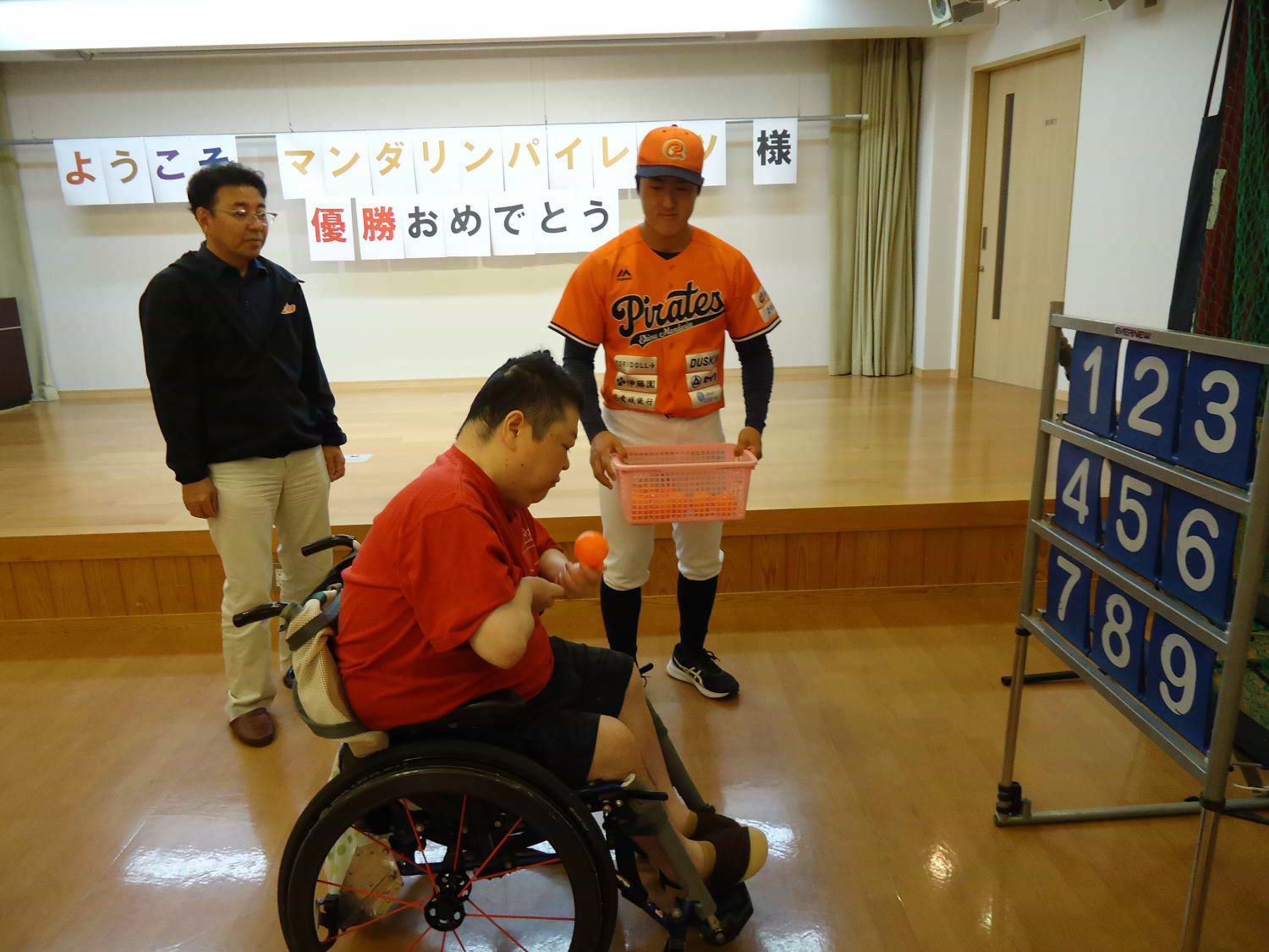 本日はマンダリンパイレーツの皆さんをお招きして、ストラックアウトに挑戦です!選手直々に手ほどきをしてもらうと見事に命中!このままスカウトされちゃうかも!?