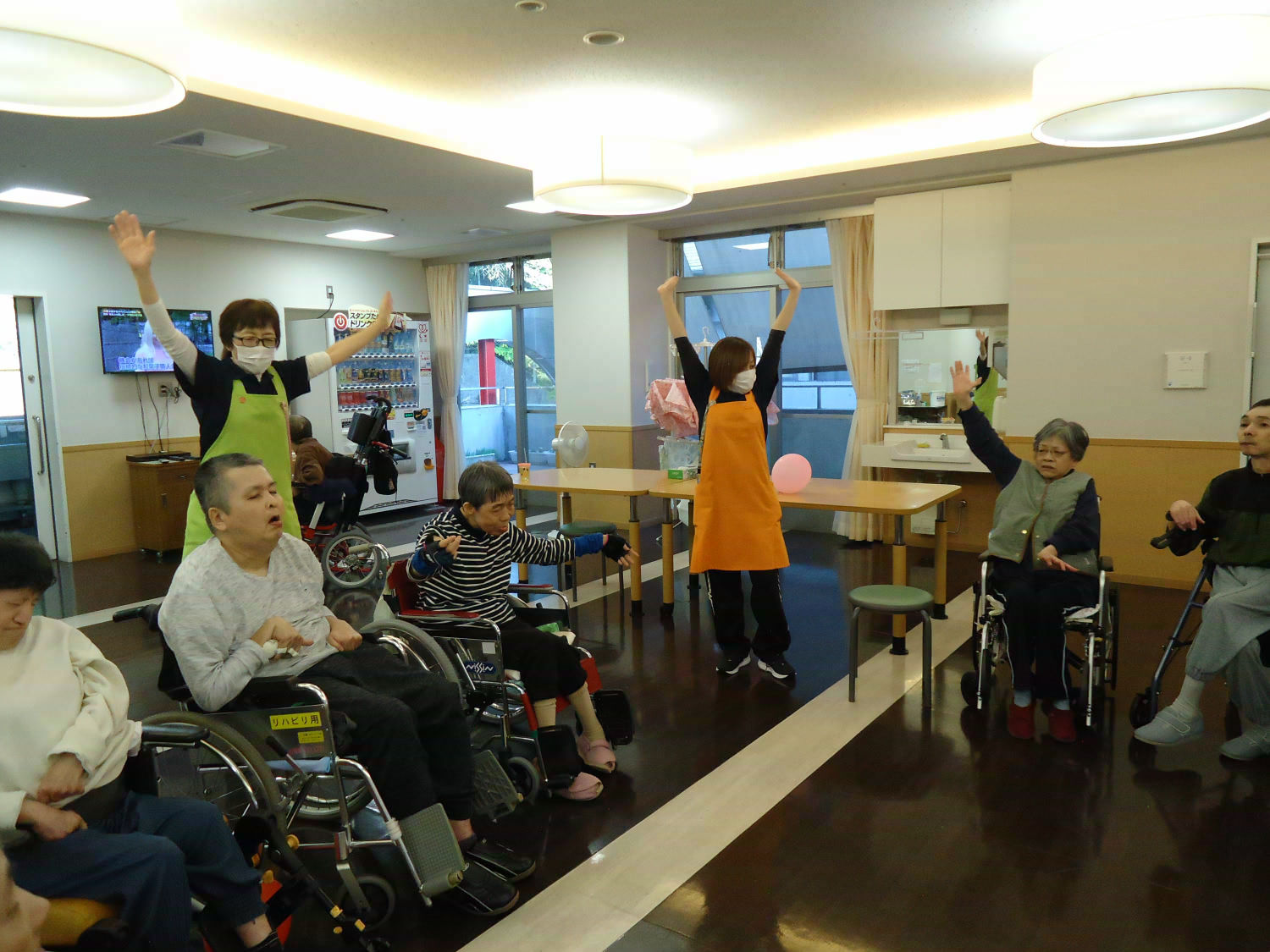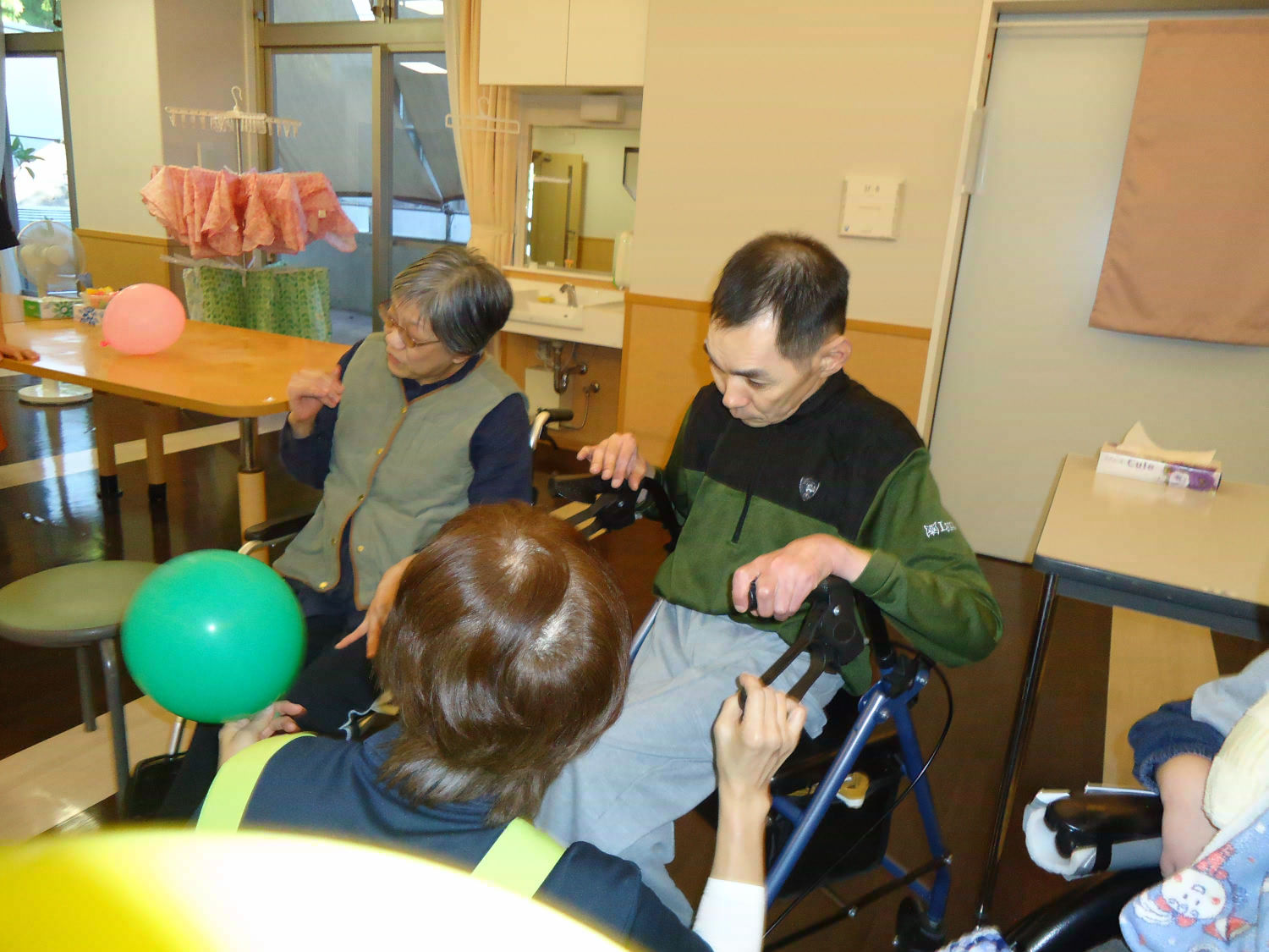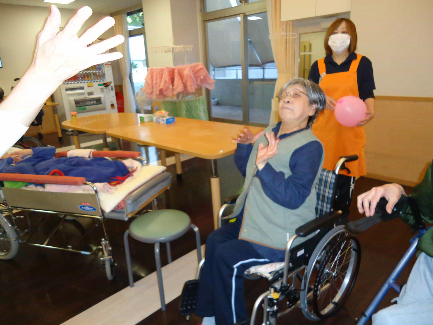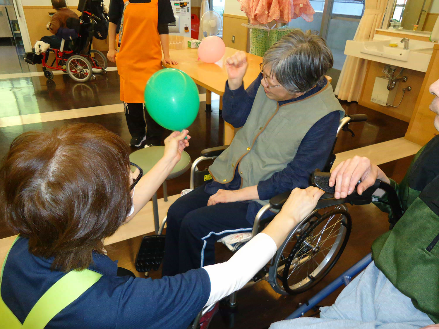 風船バレーの前に、以前研修で教わった≪笑いヨガ≫を利用者さんにしていただき、皆さん大きな口を開けて笑われました。その後の風船バレーも楽しむことが出来ました。