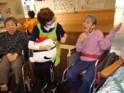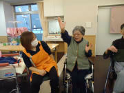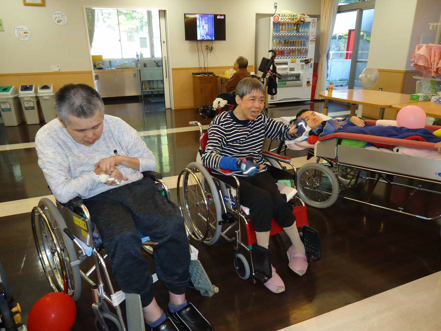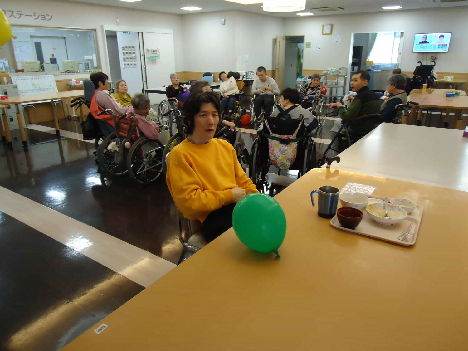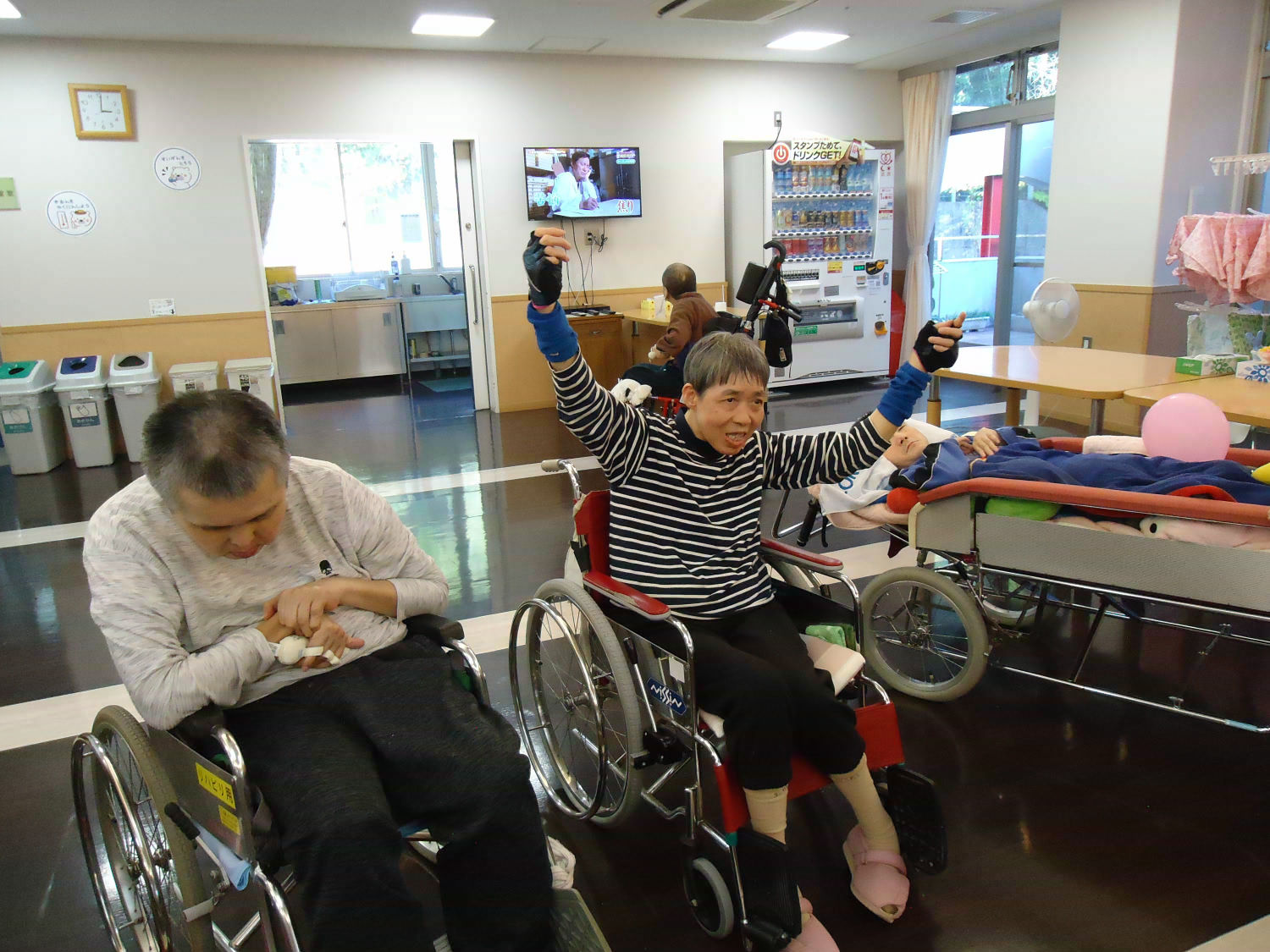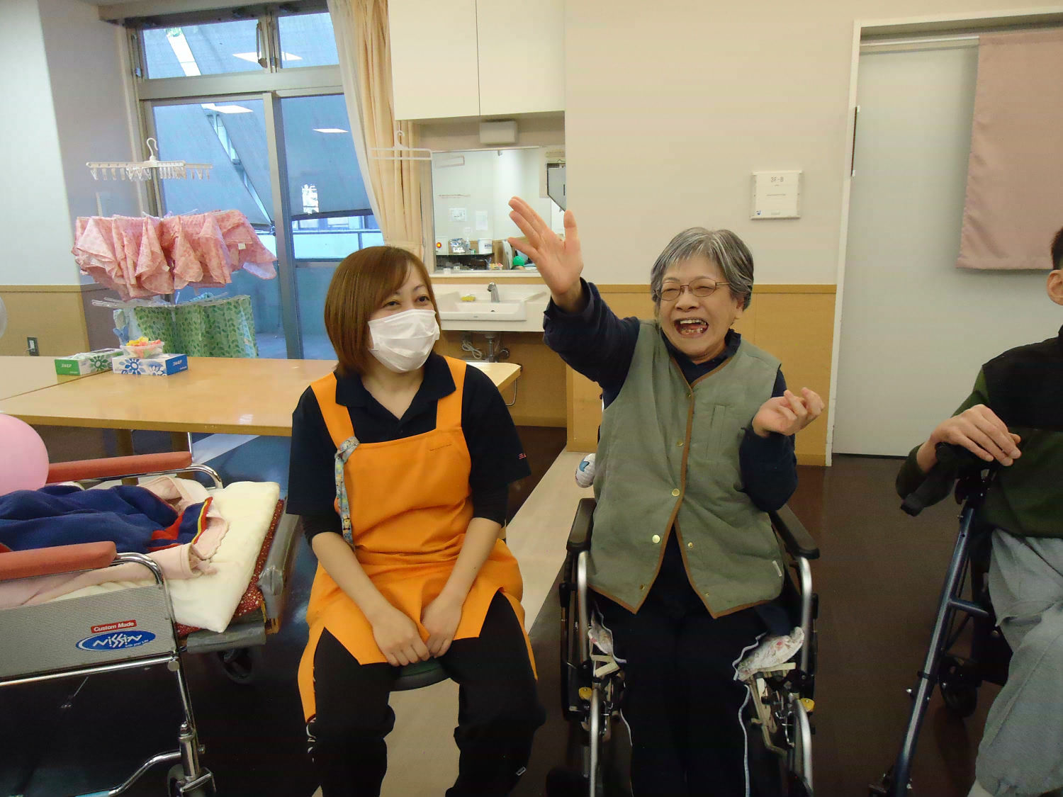 風船バレーの前に、以前研修で教わった≪笑いヨガ≫を利用者さんにしていただき、皆さん大きな口を開けて笑われました。その後の風船バレーも楽しむことが出来ました。