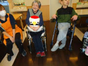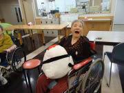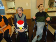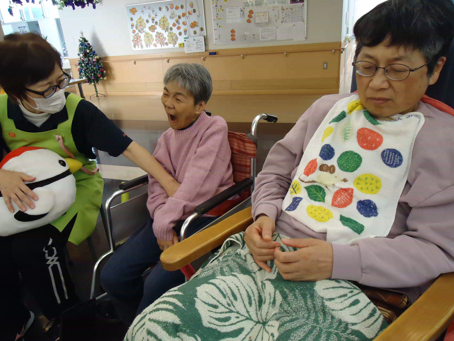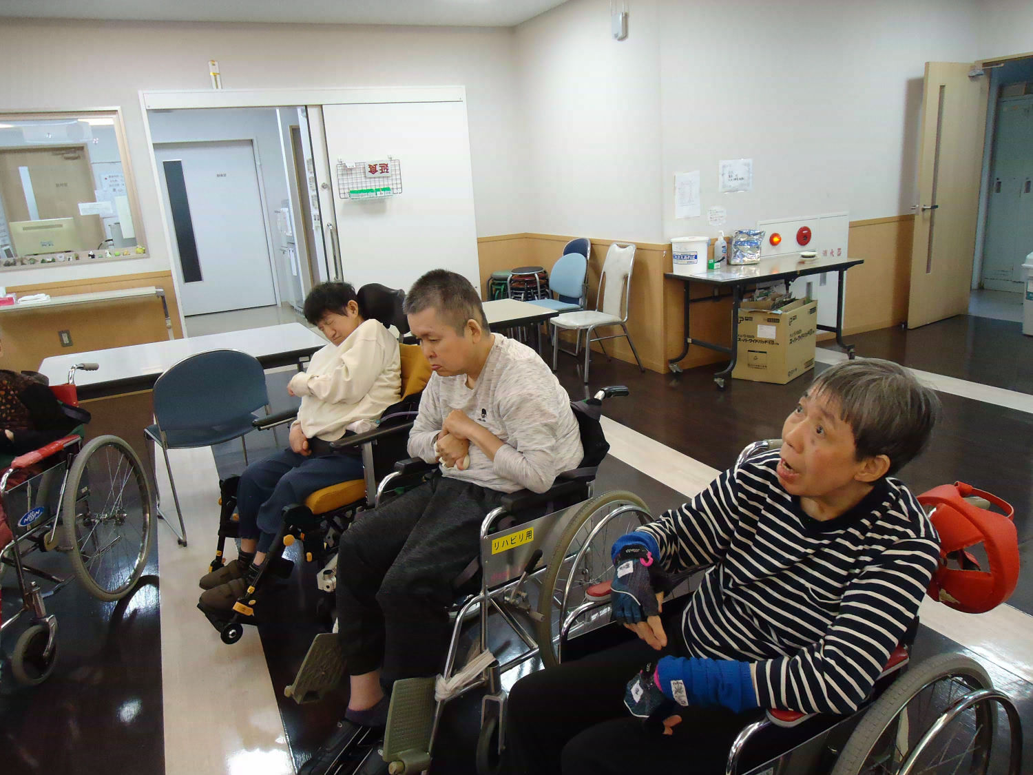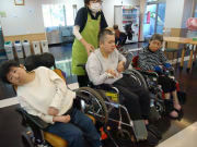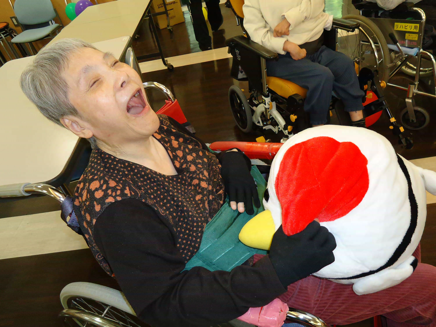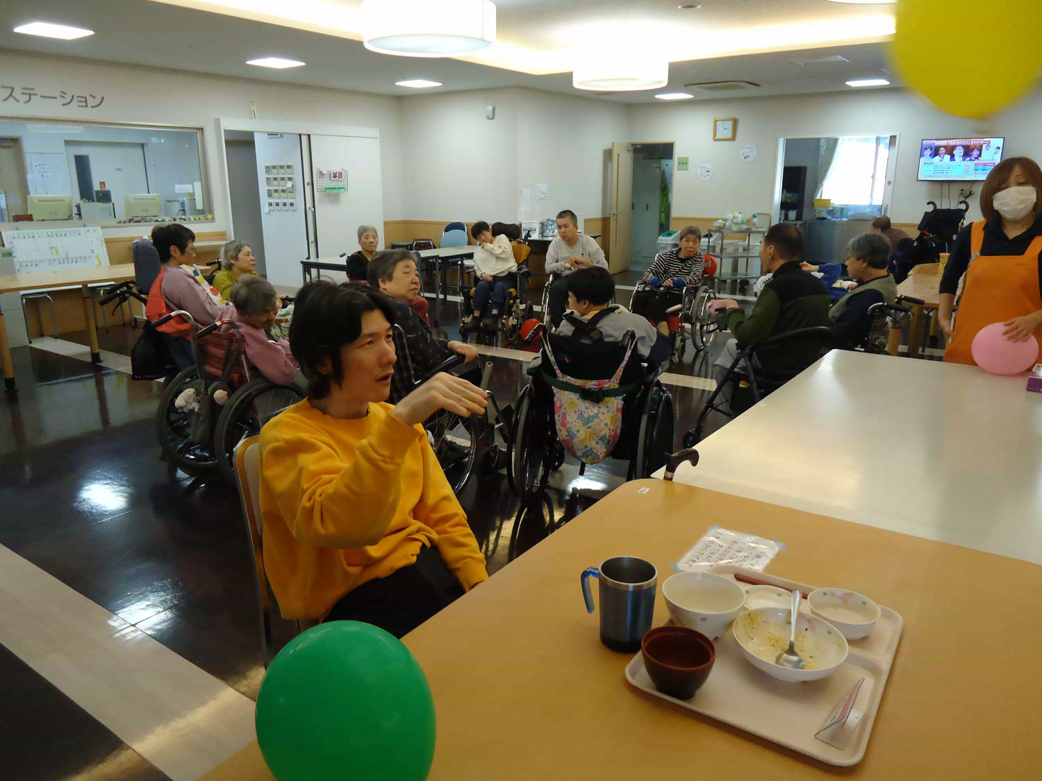 風船バレーの前に、以前研修で教わった≪笑いヨガ≫を利用者さんにしていただき、皆さん大きな口を開けて笑われました。その後の風船バレーも楽しむことが出来ました。