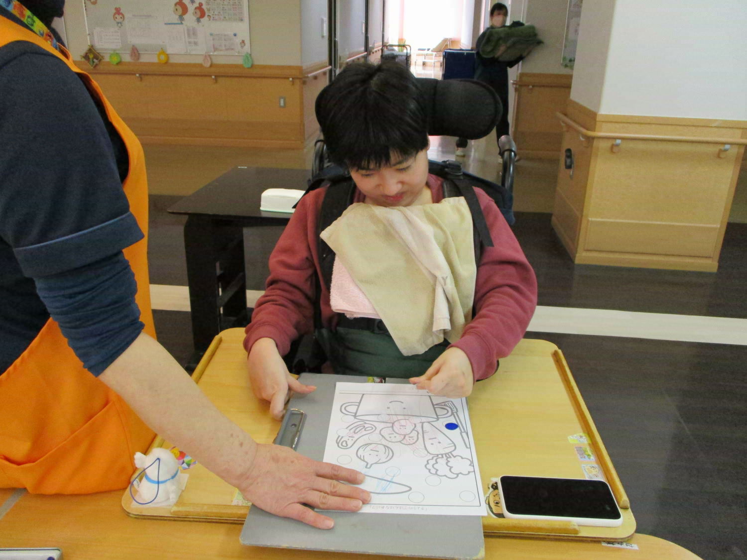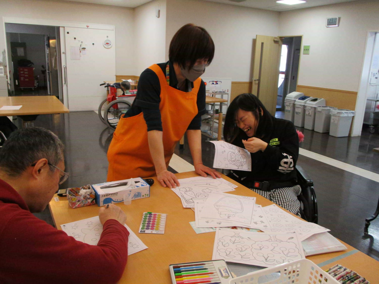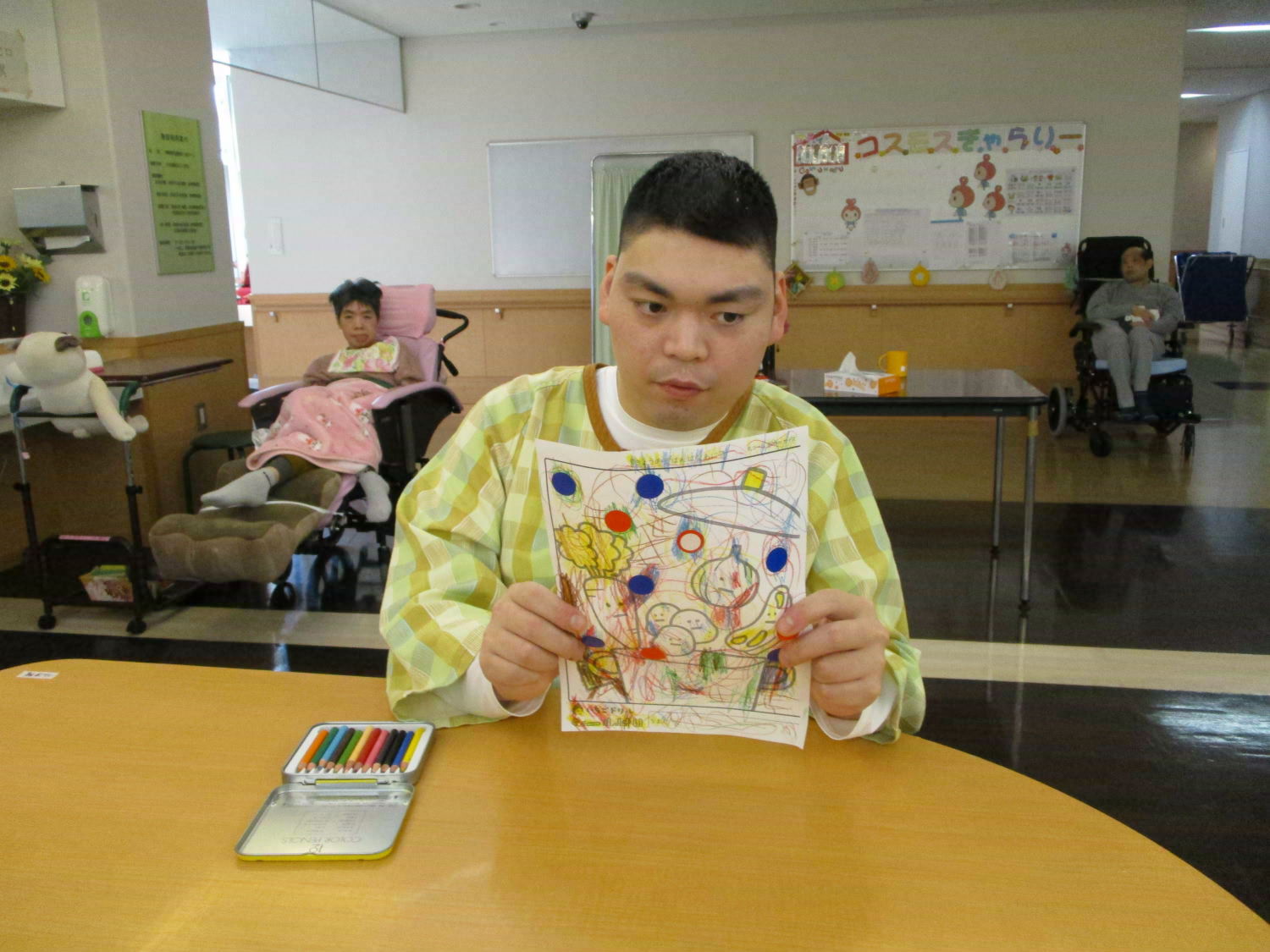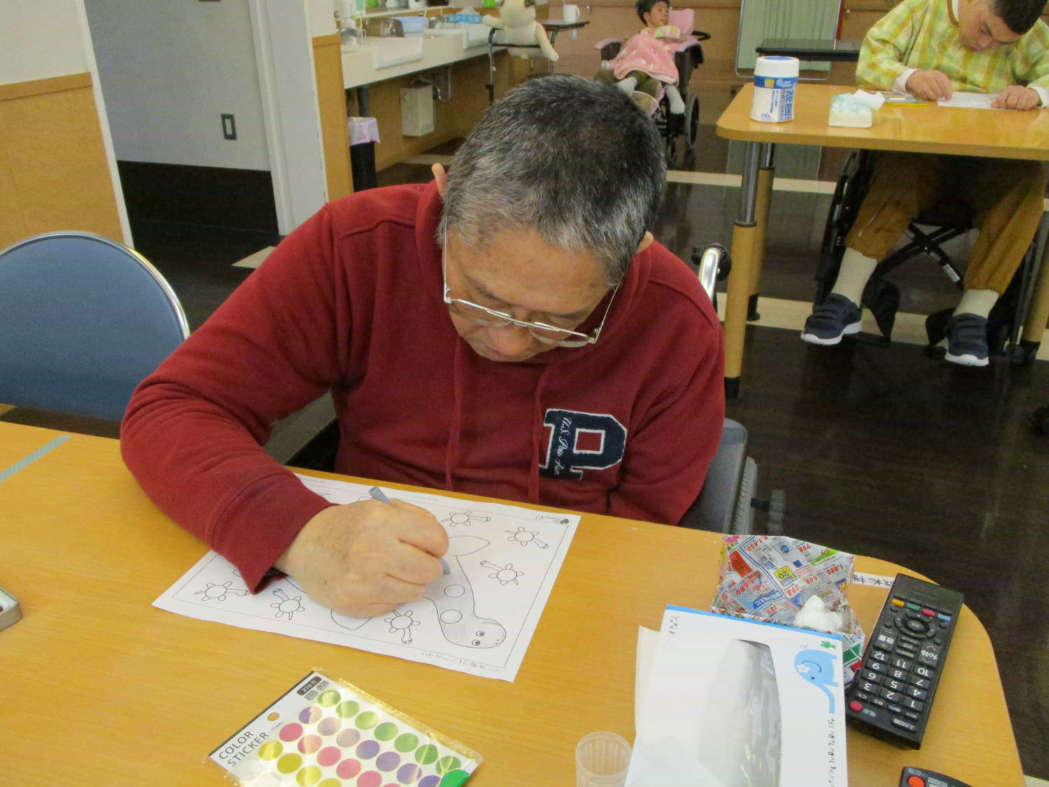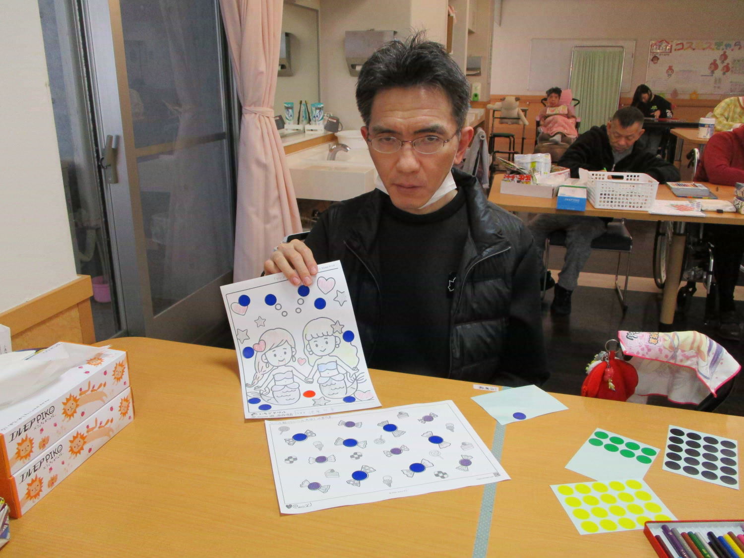 塗り絵はよく行う日中活動なのですが、今日はひと味違います。塗り絵にシールを貼って豪華に仕上げちゃいます!華やかになった塗り絵に、皆さんも普段より誇らしげでした♪