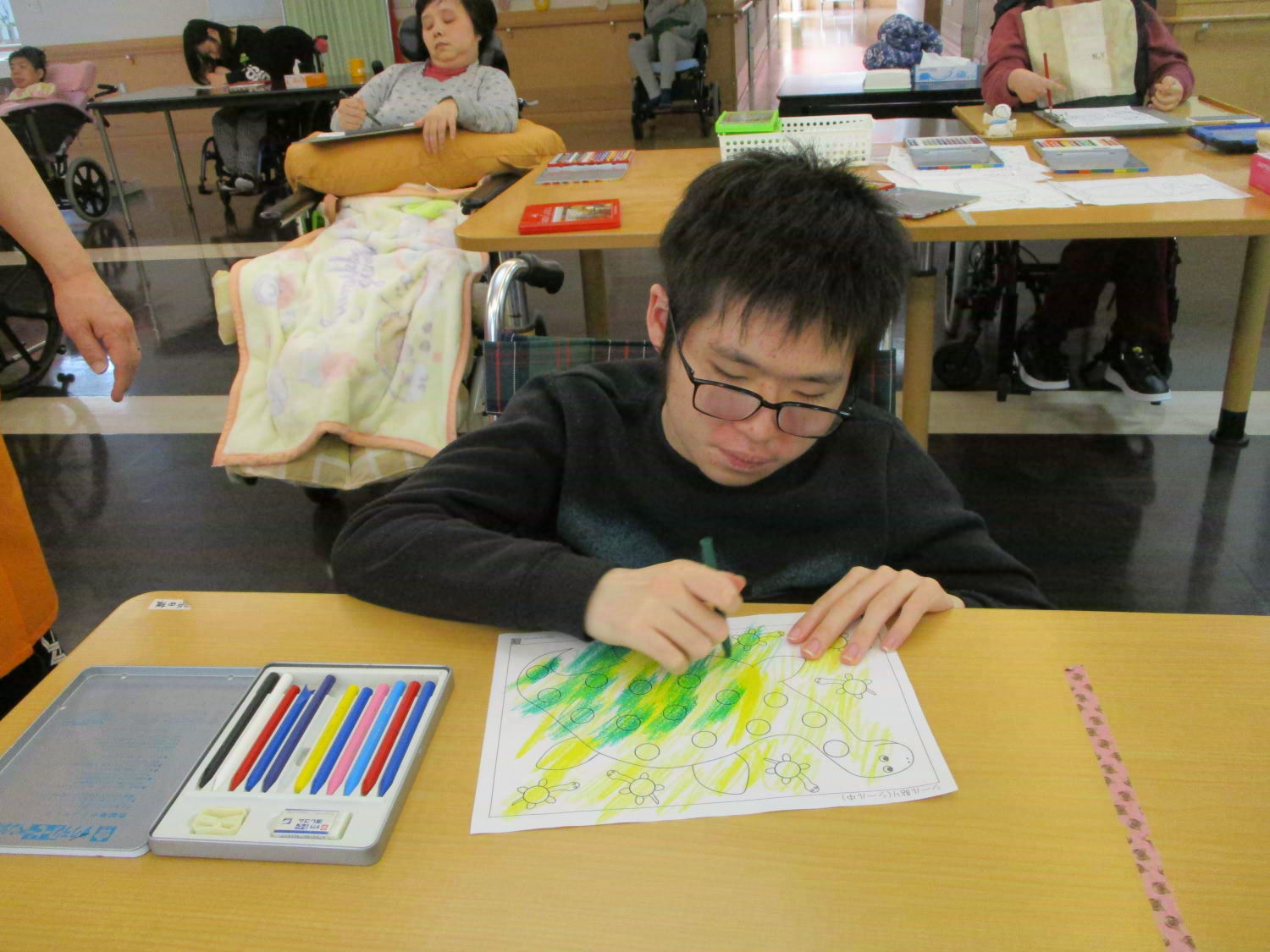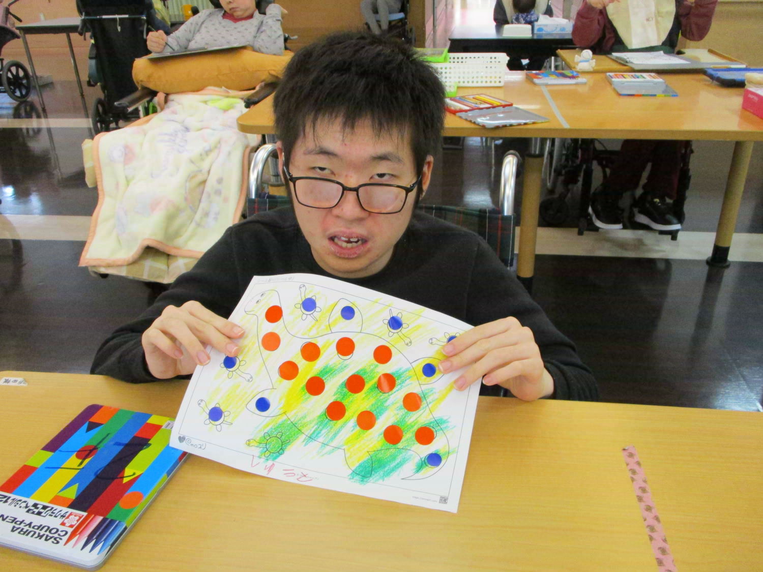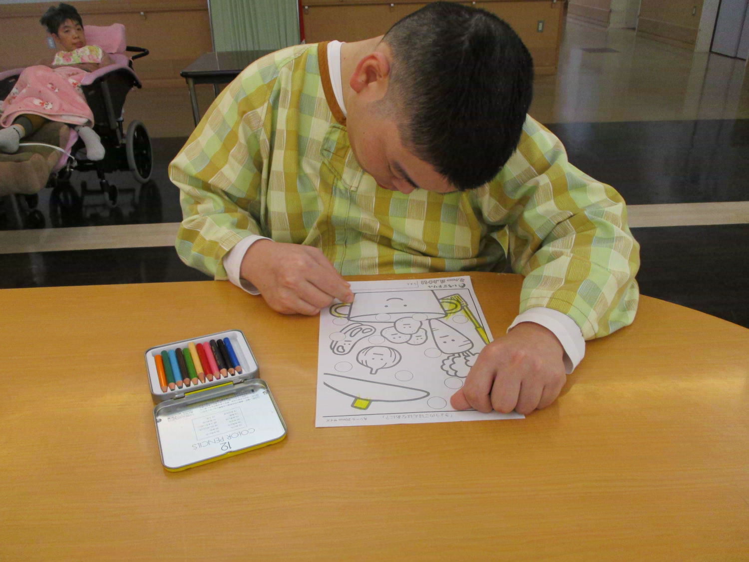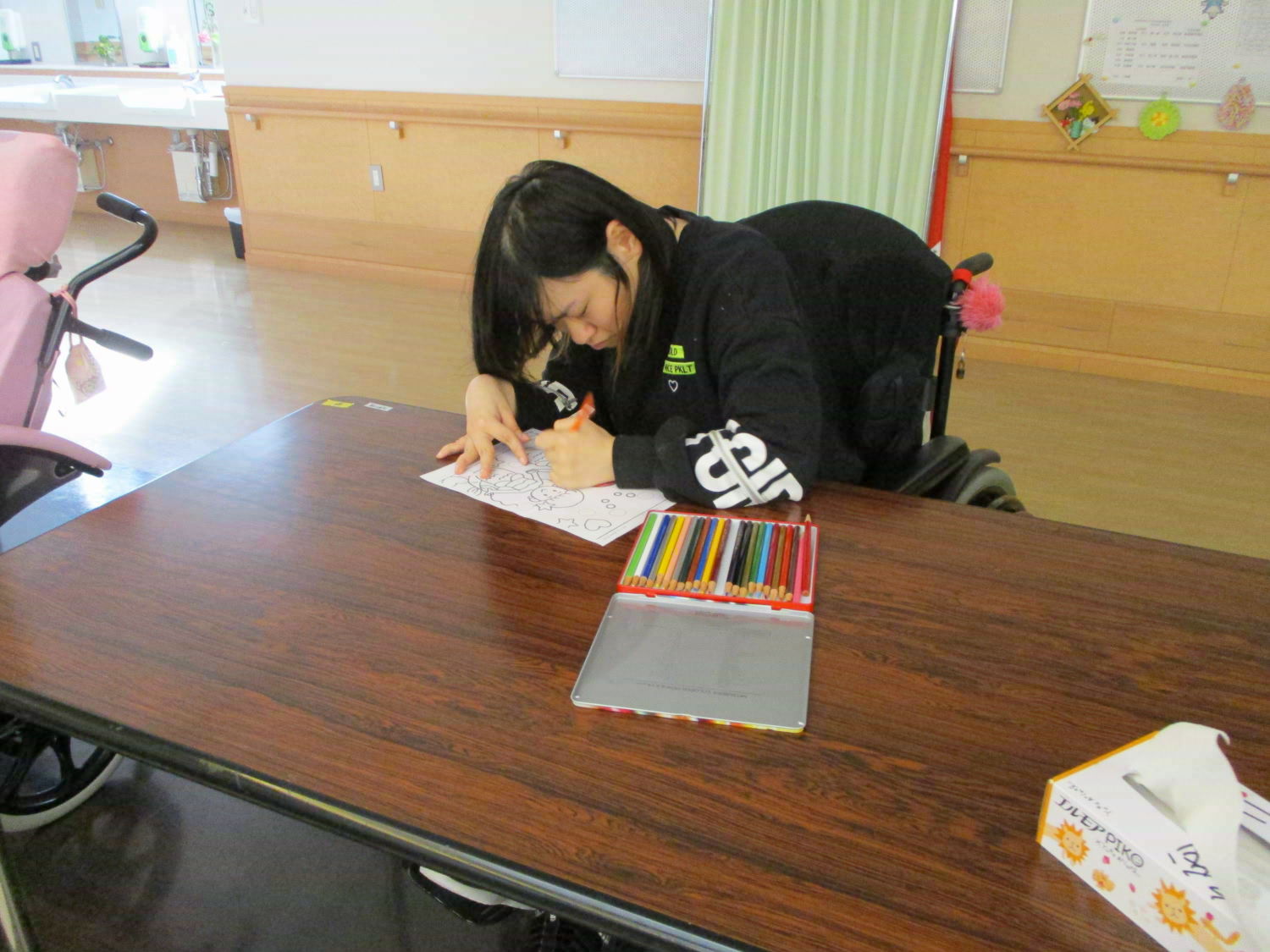 塗り絵はよく行う日中活動なのですが、今日はひと味違います。塗り絵にシールを貼って豪華に仕上げちゃいます!華やかになった塗り絵に、皆さんも普段より誇らしげでした♪
