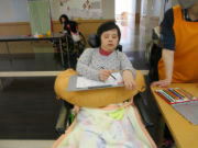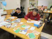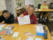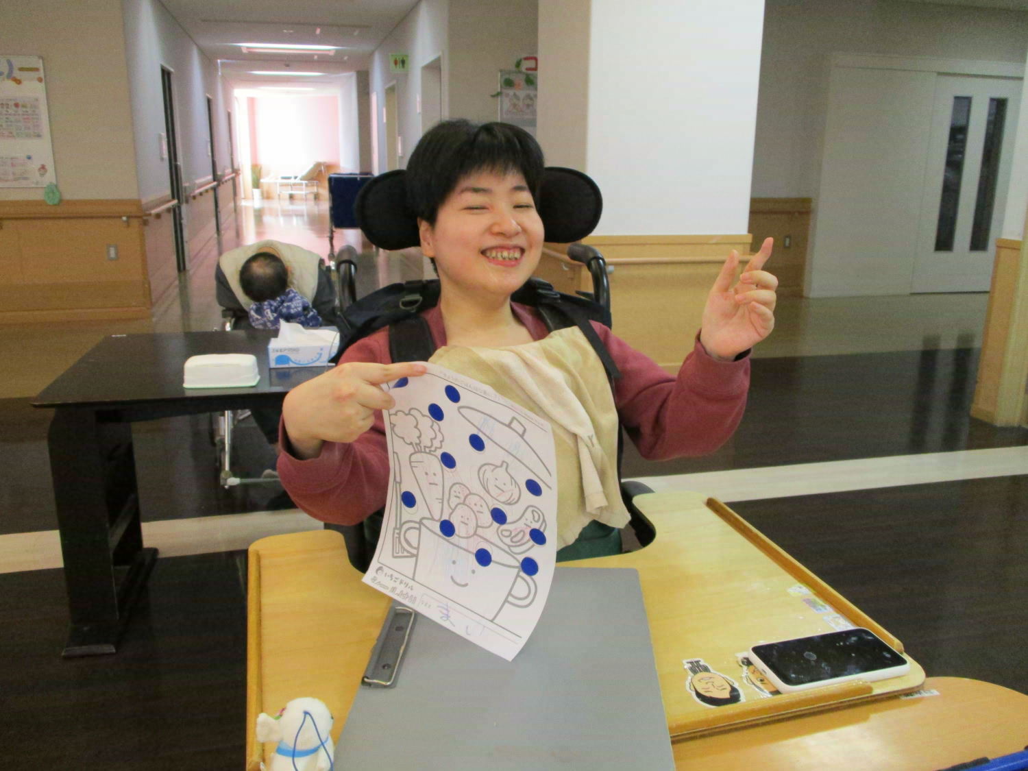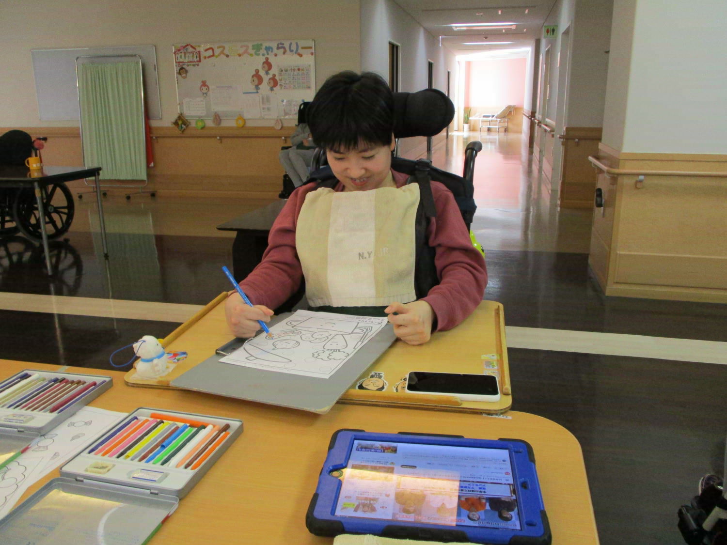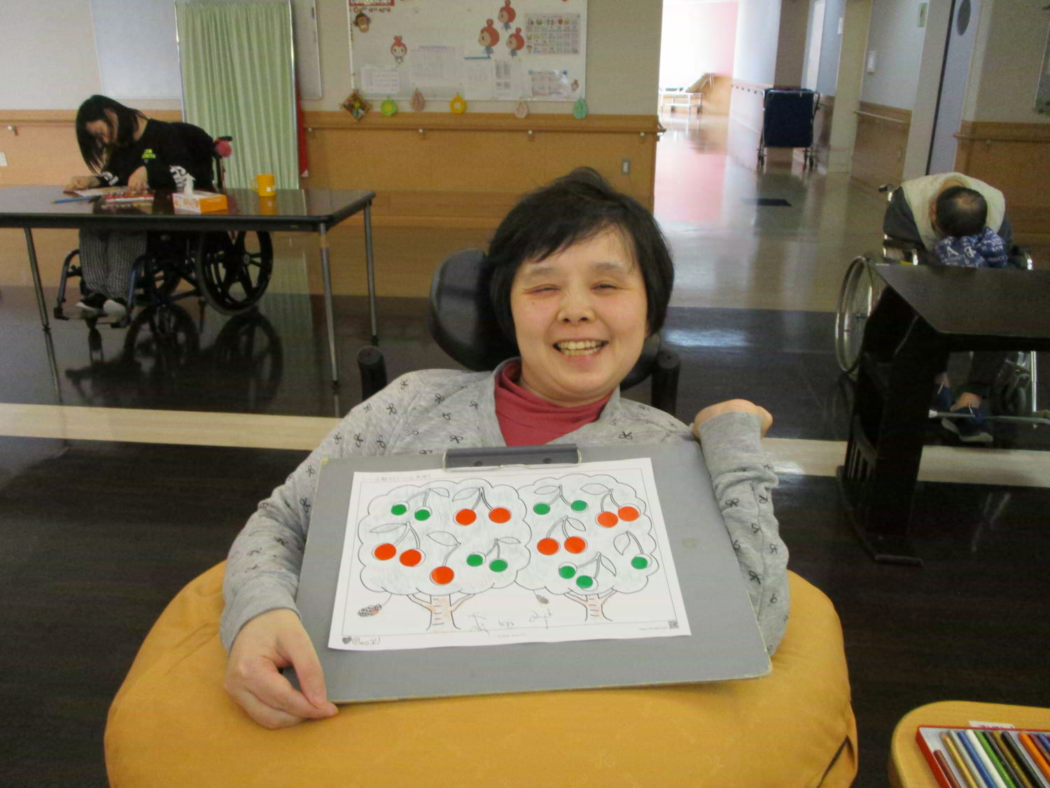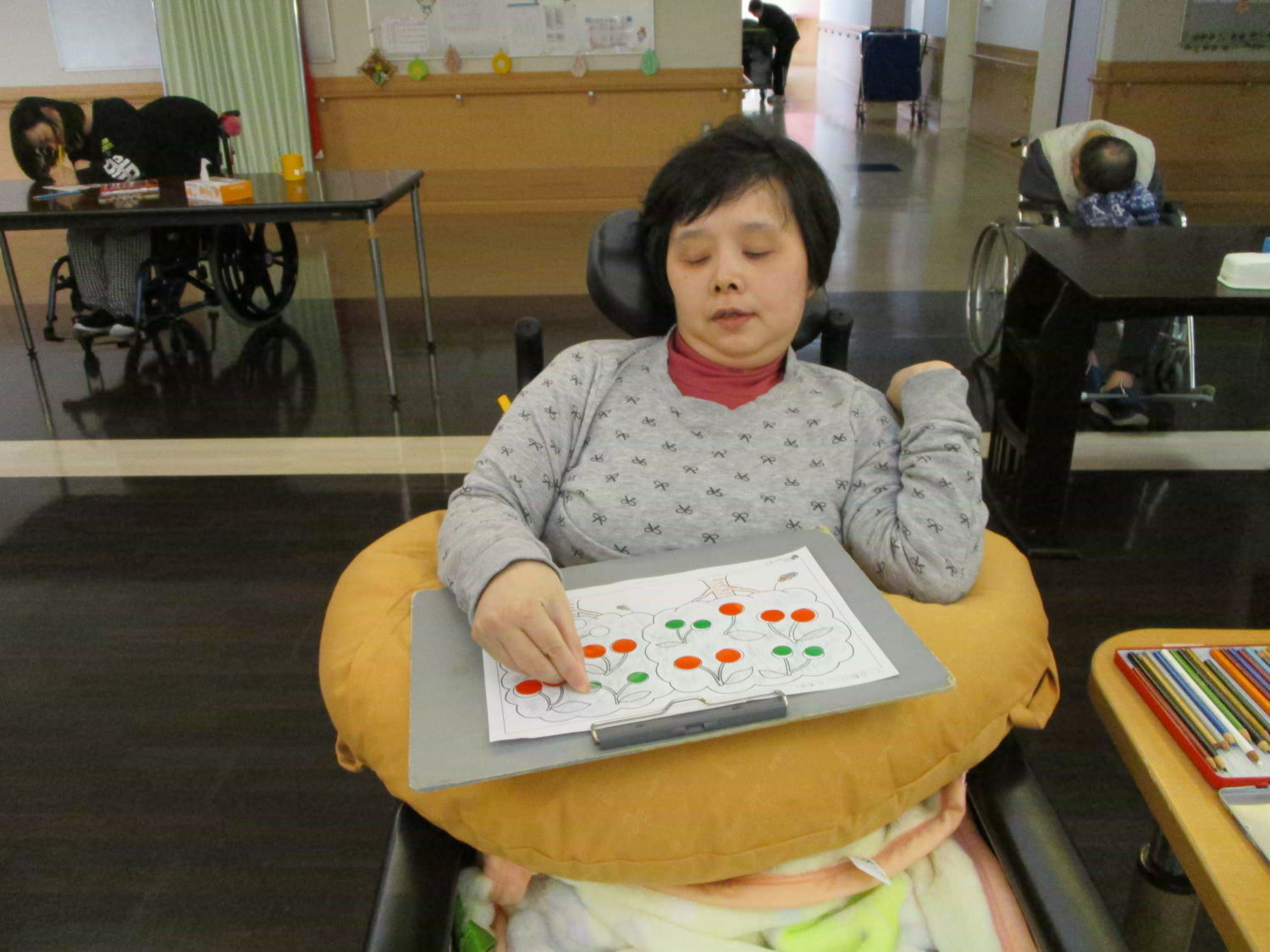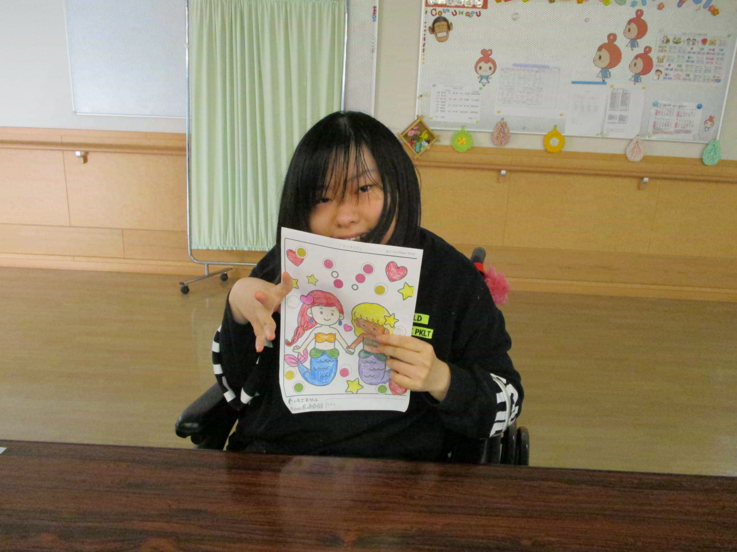塗り絵はよく行う日中活動なのですが、今日はひと味違います。塗り絵にシールを貼って豪華に仕上げちゃいます!華やかになった塗り絵に、皆さんも普段より誇らしげでした♪